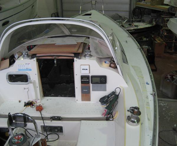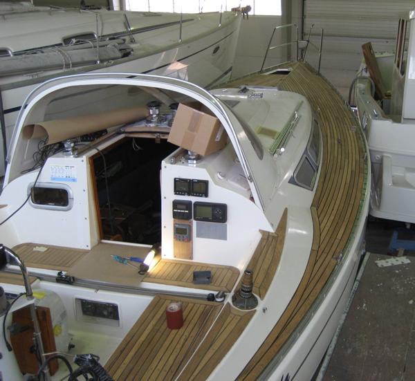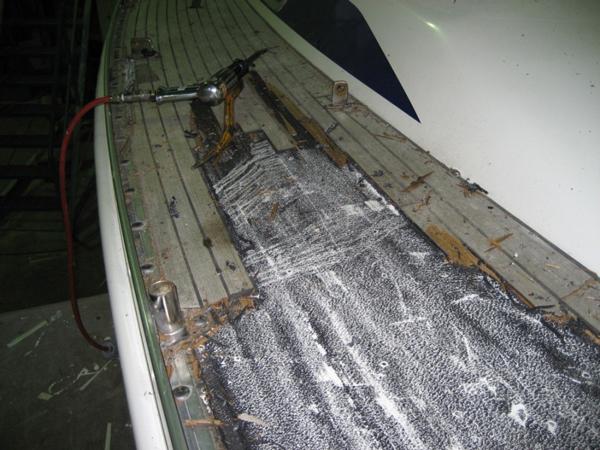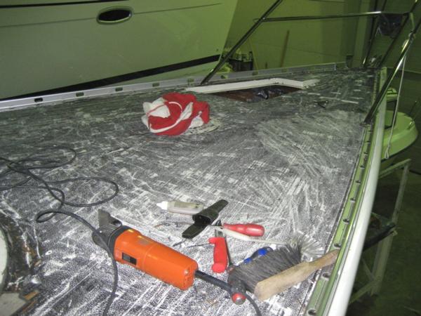 Työ alkoi veneen siirtämisellä lämpimään halliin ja kannen helojen irrottamisella helmikuun alussa. Helojen irrotustyö sujui pääosin ongelmitta – mitä nyt skuuttikiskon pulttien mutterit olivat kirjahyllyn takana verhoilun alla. Eli myös sisällä piti hiukan purkaa paikkoja ja leikata verhoiluun aukko mattopuukolla – onneksi kohta jää listan taakse piiloon. Seuraavaksi aloitettiin vanhan tiikkikannen irrotus. Ensimmäinen idea kiertää kaikki ruuvit irti osoittautui turhan työlääksi – mutta paineilmakäyttöisellä taltalla irrotus onnistui helposti – kohtuullista varovaisuutta noudattaen. Työtä helpotti huomattavasti, että vanhaa katta ei oltu liimattu kiinni. Vanhan tiikin ja ruuvien irrotuksen jälkeen kansi hiottiin epäkeskokoneella.