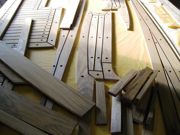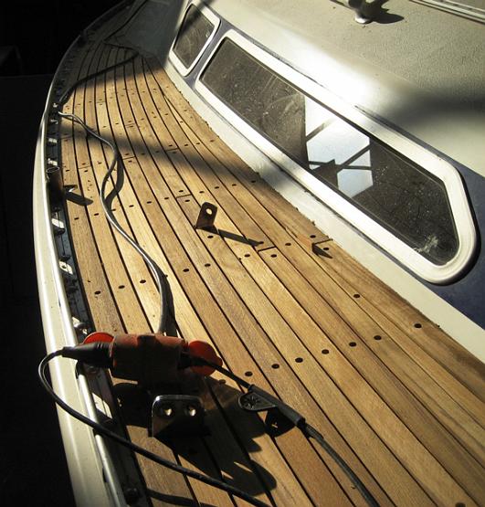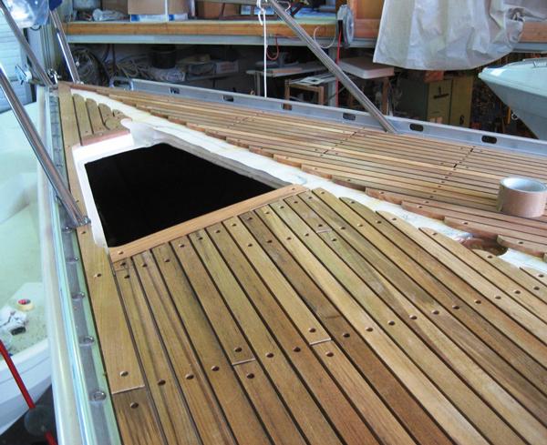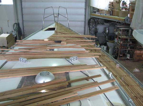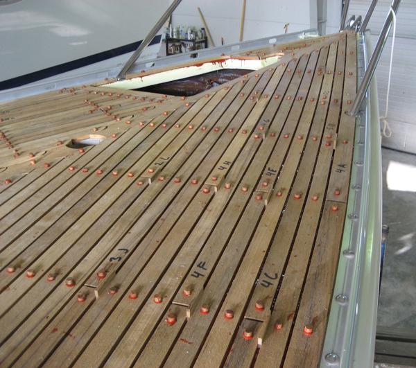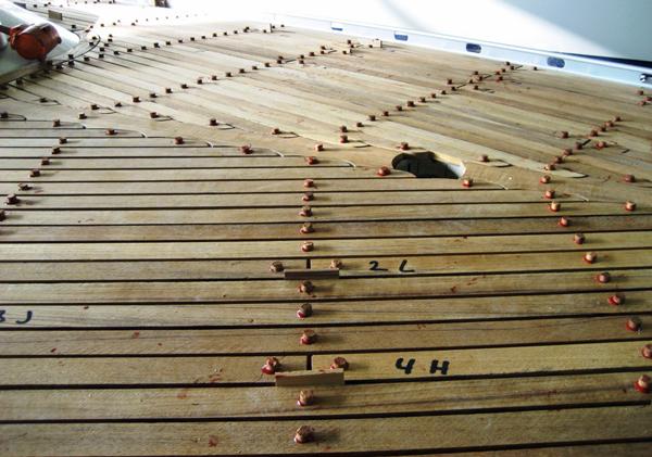 Tiikki ostettiin ns. ”pattinkina”, joka sahattiin oikean kokoisiksi rimoiksi. Avotilan istuimista tehtiin paperimuotit, jotka teipattiin vaneripöytään. Rimat sovitettiin sapluunoihin ja ruuvattiin pöytään kiinni. Saumoihin ensin primeria ja sitten kittiä. Kuivumisen jälkeen saumat hiottiin. Kanteen rimat sovitettiin suoraan paikoilleen ja ruuvattiin kiinni. Kannen kaarevimpia rimoja kasteltiin viikon ajan jotta ne hieman helpommin taipuisivat liimausvaiheessa. Kun koko kansi oli kiinnitetty valmistauduttiin liimaukseen. Liimauksessa on hyvä olla useampi henkilö – tätä remonttia teki tässä vaiheessa kolme henkeä. Kertaalleen kiinnitetyt rimat irrotettiin puoli kerrallaan, epoxiliima sekoitettiin ja työ alkoi. Liiman levittäminen sujui parhaiten lastan avulla. Liimaa levitettiin koko puretulle alueella ja sitten nopeasti ruuvaamaan tiikkirimat takaisin paikoilleen ennen sen kuivumista- aikaa 1 tunti! Kaksi henkeä sovittivat rimat takaisin ja ruuvasivat ne kiinni. Yksi henkilö tulppasi ruuvin reiät propulla mahdollisimman nopeasti: tiikkiproppu kastettiin epoxi-liimaan, painettiin paikalle ja nuijittiin vielä vasaralla pohjaan. Proppuja meni noin 1000 kpl!