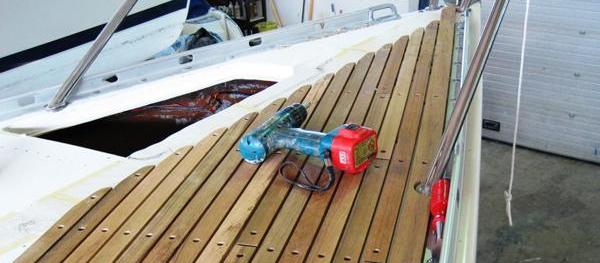 Tiikki ostettiin ns. ”pattinkina”, joka sahattiin oikean kokoisiksi rimoiksi. Avotilan istuimista tehtiin paperimuotit, jotka teipattiin vaneripöytään. Rimat sovitettiin sapluunoihin ja ruuvattiin pöytään kiinni. Saumoihin ensin primeria ja sitten kittiä. Kuivumisen jälkeen saumat hiottiin. Kanteen rimat sovitettiin suoraan paikoilleen ja ruuvattiin kiinni. Kannen kaarevimpia rimoja kasteltiin viikon ajan jotta ne hieman helpommin taipuisivat liimausvaiheessa. Kun koko kansi oli kiinnitetty valmistauduttiin liimaukseen. Liimauksessa on hyvä olla useampi henkilö – tätä remonttia teki tässä vaiheessa kolme henkeä. Kertaalleen kiinnitetyt rimat irrotettiin puoli kerrallaan, epoxiliima sekoitettiin ja työ alkoi. Liiman levittäminen sujui parhaiten lastan avulla. Liimaa levitettiin koko puretulle alueella ja sitten nopeasti ruuvaamaan tiikkirimat takaisin paikoilleen ennen sen kuivumista- aikaa 1 tunti! Kaksi henkeä sovittivat rimat takaisin ja ruuvasivat ne kiinni. Yksi henkilö tulppasi ruuvin reiät propulla mahdollisimman nopeasti: tiikkiproppu kastettiin epoxi-liimaan, painettiin paikalle ja nuijittiin vielä vasaralla pohjaan. Proppuja meni noin 1000 kpl!