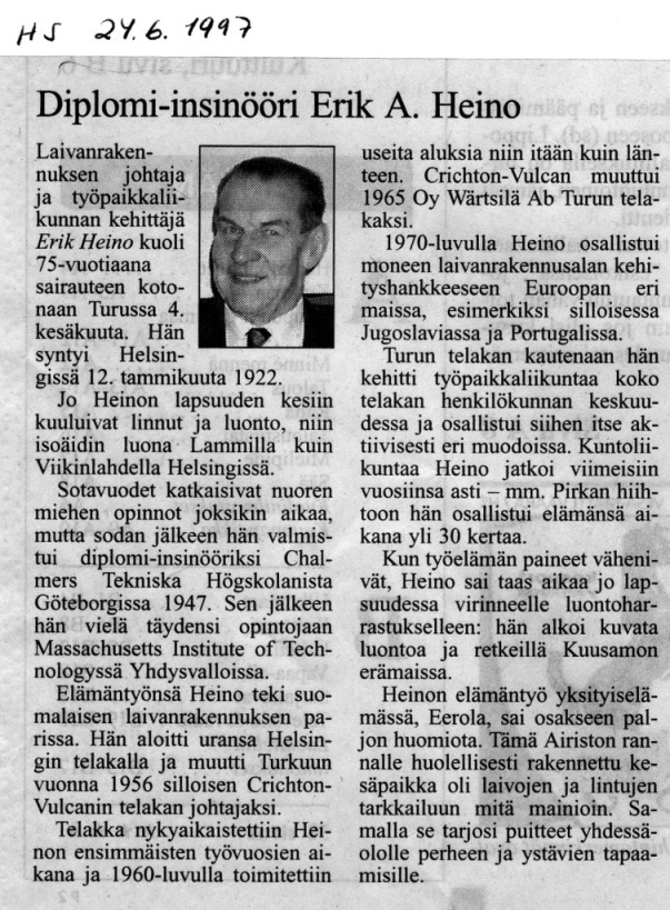 1977 – 26 vuotta kestänyt ura Turun telakan toimitusjohtajana päättyi 1972 Suomen meriteollisuuden silloisessa kriisissä, mutta työt jatkuivat konsulttina ulkomailla, mm. Hollannissa, Sveitsissä, Portugalissa ja Ruotsissa. Isäni kirjoitti myös säännöllisesti artikkeleita mm. Aamulehteen ja Talouselämään. Eerolassa alkusyksyn “Elokuun kisat” keräsivät ystäväperheet yhteen juoksukilpailun ja saunomisen merkeissä joka vuosi.