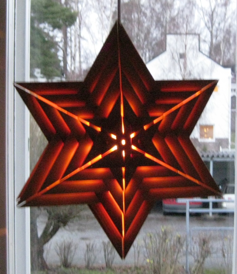 Tämä puinen tähti on muisto Ruotsin vuosiltamme 1980-luvun alussa – toisin kuin monet muut jouluvalot tämä kestää vuodesta toiseen ja sen lamppukin on helposti vaihdettavissa.