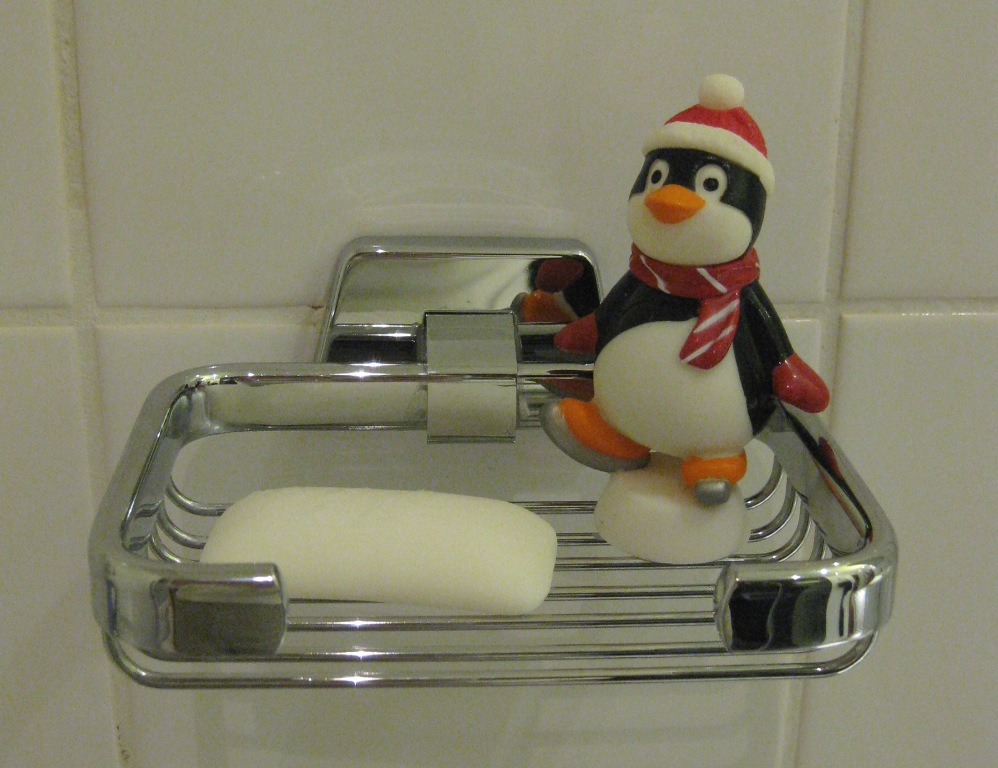 Tämän pingviinin saimme jonain jouluna lahjaksi joltain lapselta. Alunperin sen jalusta oli saippuan sisällä, mutta vaikka alkuperäinen saippua onkin kauan sitten käytetty loppuun olemme laittaneet sen joka joulu suihkua joulustamaan.