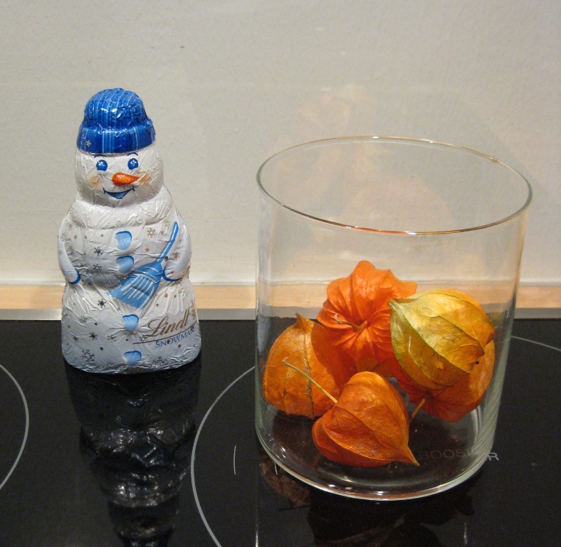 Jos puinen joulutähti oli vanha joulukoriste, niin tämä suklaalumiukko on uusi (eikä näe enää ensi joulua). Kulhossa olevat oranssit otukset jäivät vielä Halloweenin jäljiltä nekin esille, kun olivat jotenkin riittävän kivan näköisiä. Ja jouluvalmisteluillemme kuvaavaa, että tämä asetelma on lieden päällä – eikä sitä m…ontaa kertaa siitä tarvitse ruuanlaiton tieltä pois siirtää, ruuanlaittoon kun riittää mikroaaltokiertoilmauuniyhdistelmä tai sitten yksi, korkeintaan 2 levyä liedeltä.