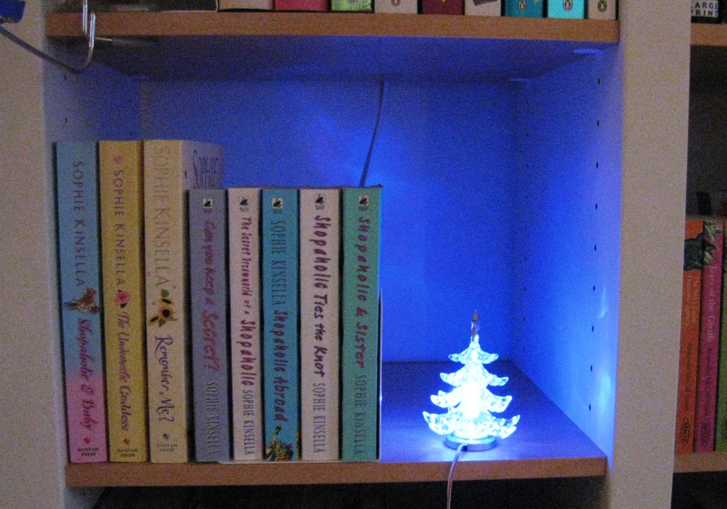 Tässä kuva USB-kuusestani – tänä vuonna sijoitin sen kirjahyllyyn ja yllätyin miten kivasti se valaisee koko sen kolon, missä se on. Viime vuonna tämä matkaili joulumatkallamme Firenzessä ja San Marinossa hotellihuoneita koristamassa!