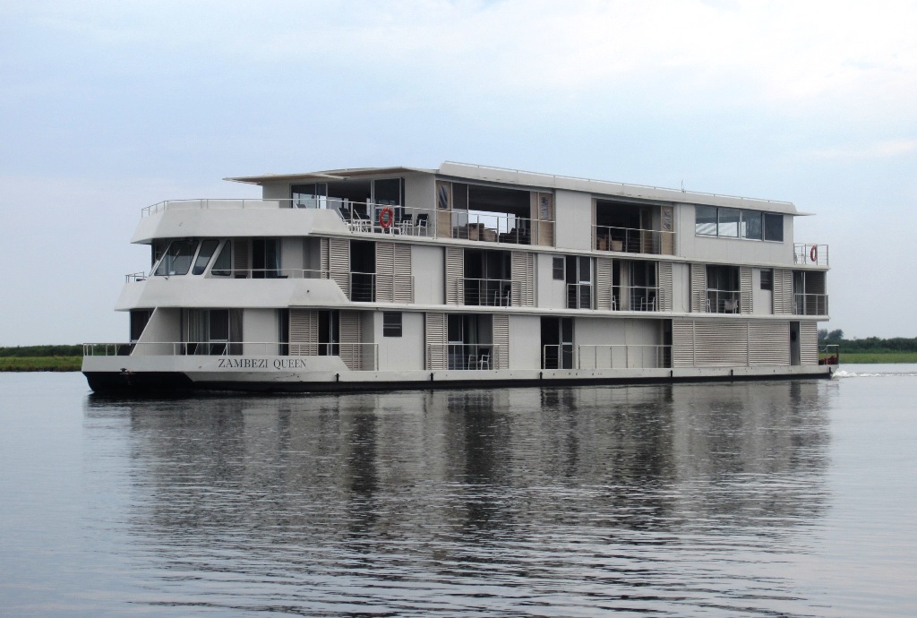 Zambesi Queen -jokilaiva on rekisteröity Namibiaan, joten matkalla sinne käytiin passintarkastuksissa niin Botswanan puolella kuin Namibiassa. Zambesi Queenillä Olympian matkan 25 -hengen ryhmä täytti koko laivan, eli laiva oli vain meidän käytössämme. Hytit olivat hyvätasoisia, mutta malaria-alueella olevalla joella ilmastoinnin puuttuminen oli hiukan hankalaa – illalla ennen valojen sytyttämistä piti varmistaa, että kaikki verkko-ovet ovat kiinni ja silti niiden rakosista taisi aina muutama hyttynen livahtaa sisälle. Laivalla ei myöskään ollut tarjolla pientä yövaloa ja tuulettimen sähköä lukuunottamatta öisin sähköä, eli illalla kiltisti nukkumaan kello 22! Jokiretket laivalta suuntautuivat enimmäkseen ihan samalle alueelle kuin jokiretket Chobe Game Lodgesta, mutta lisäksi laivalta tehtiin joitakin retkiä Namibiaan: tutustuimme paikalliseen pieneen kylään ja muutama ateria tarjottiin maissa, Afrikan öisen taivaan alla tai päivällä rannan aurinkokatoksiin.