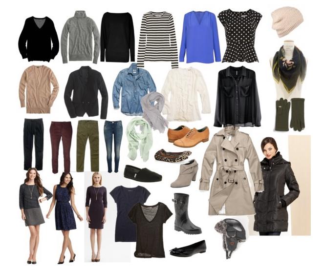 Kuvassa on yksi esimerkki tällaisesta 33 vaatteen yhden sesonkin vaatevarastosta – siis ideana käyttää vaan näitä vaatteita (lisäksi vain alus-, koti- ja urheiluvaatteet).