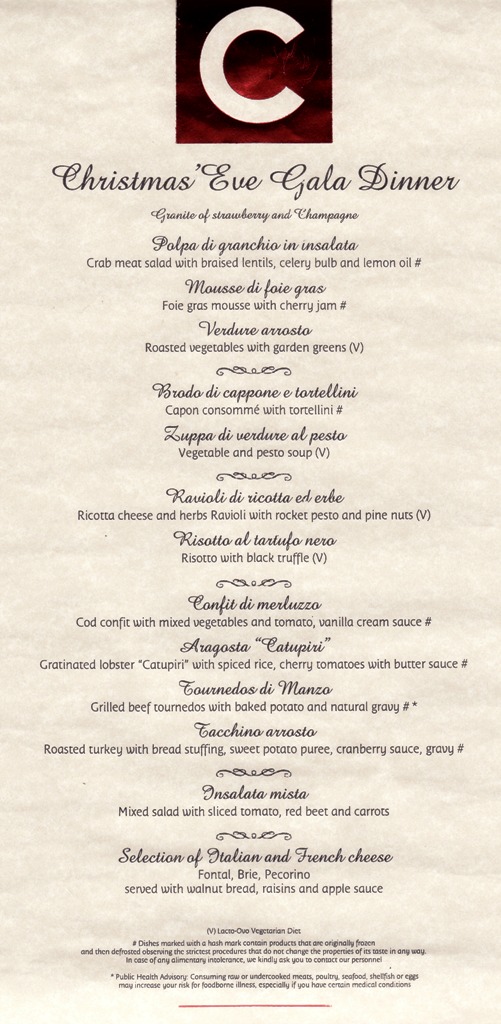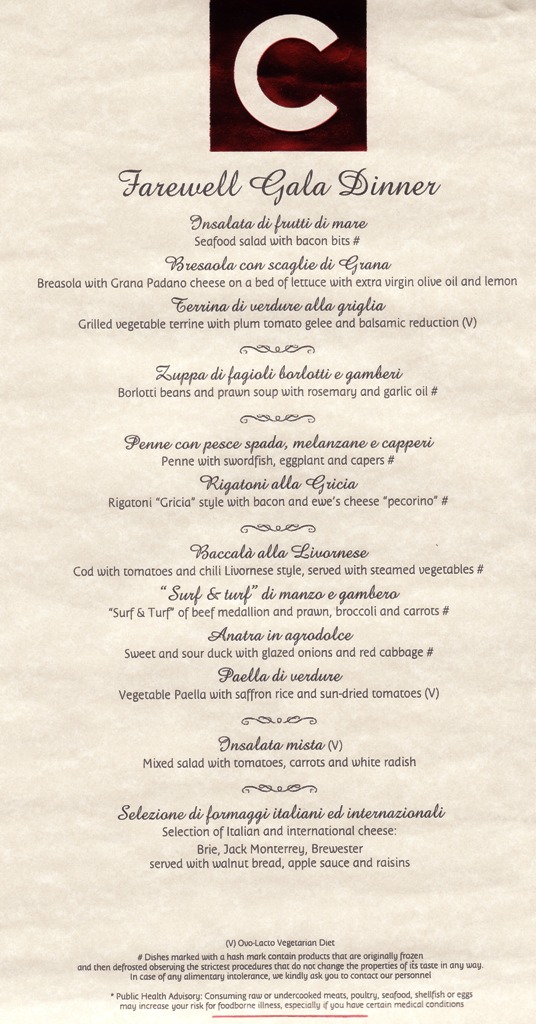 Illallisen nautimme useimmiten a la carte -puolella valiten tarjolla olevasta 7 ruokalajista (alkuruoka, keitto, pasta, pääruoka, salaatti, juustot, jälkiruoka) tyypillisesti vain 3-4 ruokalajia. Lounaan nautimme muutamana päivänä maissa, muutamana päivänä laivalle palattuamme buffet -puolella ja meripäivinä a la carte -puolella. Aamiaisen buffet -puolella jos oli kiire ja erityisesti meripäivinä a la carte -puolella kiireettömästi. Illalliskattauksia oli kaksi, ja valitsimme jo matkaa varatessamme aikaisemman kattauksen (18:15) – 20:45 tuntui meille turhan myöhäiseltä. Meiltä kysyttiin myös toiveita pöytiin sijoittelusta (risteilyllä on illalliselle vakiopöytä ja vakiotarjoilija) ja taisimme sanoa, että vaihtoehdot 2-8 hengen pöydässä ovat ok, mutta päädyimme sitten 2 hengen pöytään, mikä meille sopi ihan hyvin. (Laivalla tällä risteilyllä taisi olla yhteensä vain 3 suomalaispariskuntaa, mutta emme tutustuneet n. 2500 matkustajan joukosta näihin.) Lounailla, joissa istumajärjestys oli satunnainen, juttelimme muutamien muiden matkustajien kanssa, jotka sattuivat olemaan Kanadasta ja USA:sta. Kansallisuuksista laivalla tuntui olevan eniten edustettuna italialaiset ja amerikkalaiset, mutta toki mukana oli myös paljon saksalaisia, ranskalaisia, englantilaisia ja kanadalaisia.