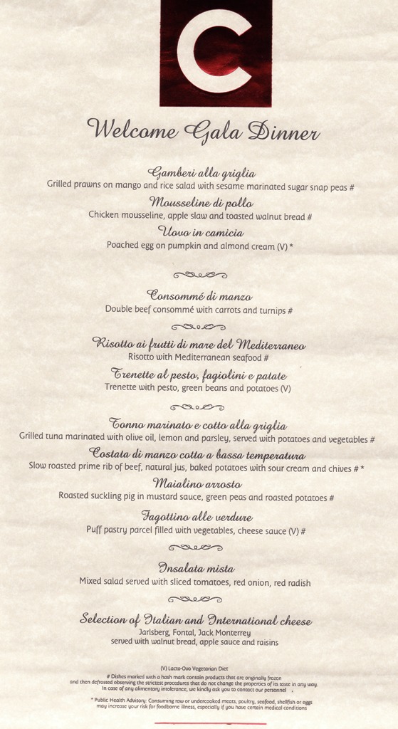 Costan päädyimme valitsemaan (kuten kaikki aikaisemmatkin risteilymme) pääasiassa reitin, ei niinkään laivayhtiön perusteella. Itse asiassa Royal Caribbean -varustamon X of the Seas -laivoihin olisi voinut olla ihan mielenkiintoista tutustua, mutta kun tämän Costa Mediterranean reitti ja aikataulu tuntui kolahtavan meille paremmin, niin päädyimme tähän. Siitä huolimatta, että jo edellisellä Costalla tehdyllä risteilyllä (Dubai 2011) ajoittain italialaisuudessa oli hiukan kestämistä … ja siitä huolimatta, että Costa Concordia makaa Italian rannikolla kapteeni Francesco Schettinon jäljiltä.