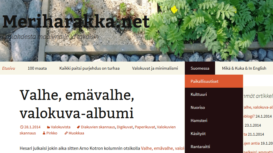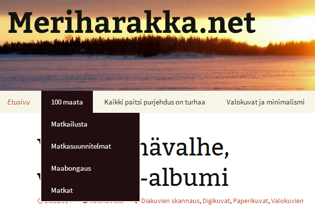Valikoiden ylintä sanaa (100 maata, Kaikki paitsi purjehdus on turhaa, Valokuvat ja minimalismi jne.) klikkaamalla saa näkyviin kuvauksen kyseisestä aihepiiristä blogissa.