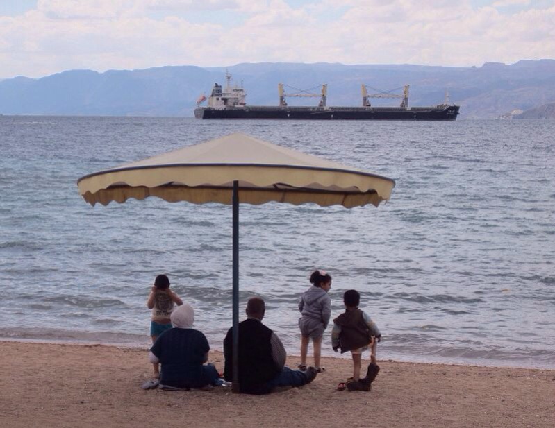 Aamulla pakotamme itsemme heräämään (tasoltaan heikohkolle) aamiaiselle ja lähdemme pian sen jälkeen tutustumaan kaupunkiin. Aqaba vaikuttaa näin maaliskuun alussa hiukan uneliaalta, hiukan ränsistyneeltä rantakaupungilta, jossa joka toinen pieni liike myy sukellusretkiä tai retkiä Petraan tai Wadi Rumiin. Isompia ja pienempiä moskeijoita riittää. Kahviloissa istuu paikallisia polttamassa vesipiippua ja niitä myydään niissä joka toisessa liikkeessä, melkein. Turisteja näkyy, mutta ei paljoa. Päädymme pienvenesatamaan ja siellä aallonmurtajalle tuijottamaan vastarannalla sijaitsevaa Eilatia, jossa olemme käyneet kahdesti, yli 20 vuotta sitten. Tunnistamme muutaman isomman kolmionmuotoisen hotellirakennuksen. Jatkamme pienelle yleiselle rannalle, kaupungin ainoalle sellaiselle, sillä pääosa rannoista on hotellien. Ilma ei ole ihan rantalämmin, mutta rannalla on joitakin perheitä: naiset tiukasti vaatetettuina päästä varpaisiin, mutta lapset uima-asuissa. Lasse pyytää lupaa kuvata joitakin nuoria tyttöjä kaavuissaan ja päätyy myös itse kuvaan tyttöjen kännyköihin – vähän kuin Intiassa aikoinaan. Käymme vielä katsomassa ison Al-Hussein Bin Ali -moskeijan ja päädymme lopulta läheiseen Ali Baba -nimisen ravintolan terassille seuraamaan paikallista elämänmenoa ja syömään erinomaista lounasta: halloumileipiä ja sipulikeittoa.