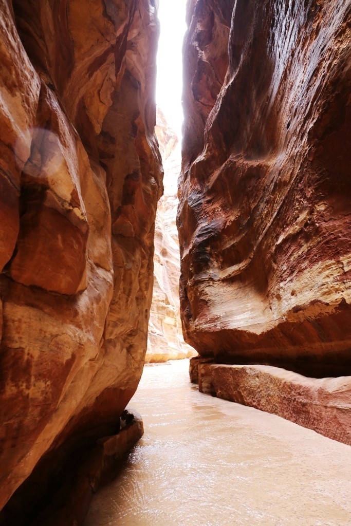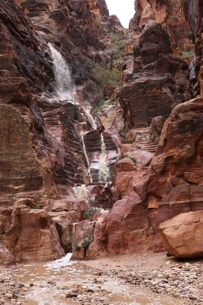 Kirjoittauduimme sisään hotelliin, luminen tiekään ei houkutellut ihan nyt ihan heti taas ja huone oli joka tapauksessa jo maksettu. Pidimme kahvi/kaakaotauon ja mietimme vaihtoehtoja, kun kuulimme, että nyt Petraan pääsee – ja että sinne olisi hyvä lähteä heti, sillä mahdollisesti kaupunki suljetaan taas kohta. Pääsimme oppaamme kanssa matkaan, laskeutumaan Siqin kalliosolaa alas Aarrekammiolle (Treasury) asti – ja jo matkalla oppaamme sai tiedon, että sitä pitemmälle ei nyt pääsekään. Syynä kaupungin sulkemiseen ensin kokonaan ja sitten Aarrekammiolta alaspäin olivat tulvat. Kaikkialta solaa ympäröiviltä kallioilta valuva vesi ja sulava lumi pakkautuivat solaan ja muuttuvat tien vuolaasti virraksi. Aarrekammiolle asti kävellessämme hypimme välillä kiveltä toiselle kävelykelpoista kohtaa etsiessämme (ja taas kiitin jalkani kuivani pitäneestä Dr Martenseja katsoessani säälien joidenkin muiden läpimärkää tennareita).