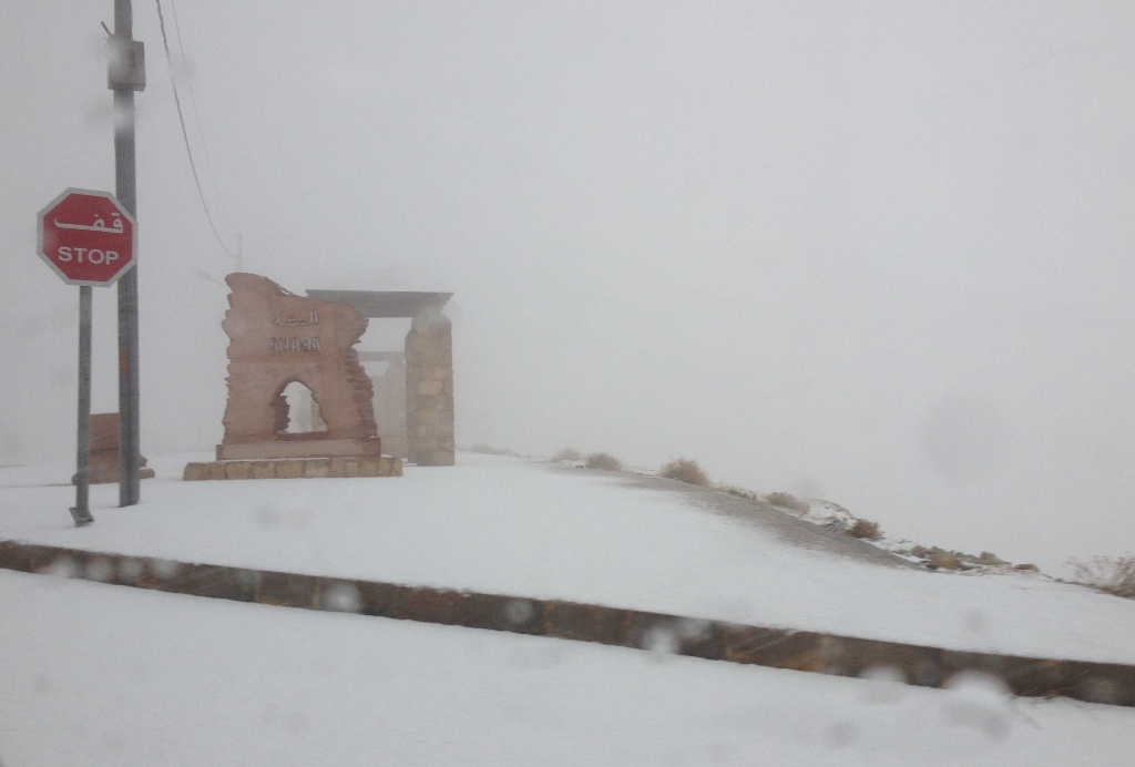 Aluksi lämpötila oli 9 astetta emmekä oikein uskoneet, että näkisimme lunta, mutta niin vaan noustessamme ylöspäin lämpötila laski pariin asteeseen ja tien reunoilla alkoi näkyä pieniä määriä lunta. Aqaba – Amman valtatieltä erkaneva tie Petraan oli paikoitellen täysin sumun vallassa, näkyvyys muutamia metrejä. Tällaista olimme viimeksi kokeneet Nordkappissa. Ja Petraa hitaasti lähestyessämme maa muuttui valkoiseksi, lunta oli useita senttejä ja pienemmät autot seisoivat ylämäissä pääsemättä niitä ylös.
