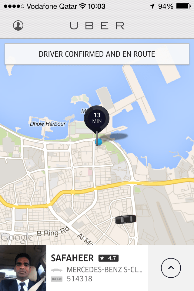 Uber-taksin käyttöön oli valmistauduttu jo kotona lataamalla puhelimeen sovellus ja rekisteröitymällä palveluun. Uberhän ei ole taksiyritys vaan yritys, joka maailmanlaajuisesti yhdistää asiakkaat ja kuljetusyrittäjät. Rekisteröintisivulla on oletusarvoisena palvelumaksun suuruus 20% USA:n käytännön mukaisesti, mutta sen voi itse vaihtaa kyseisen maan käytännön mukaiseksi.
