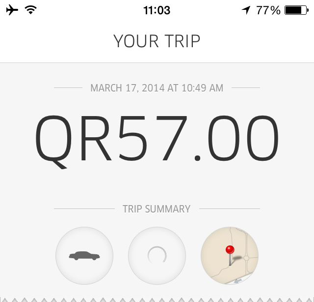 Ostoskeskukselta tulimme takaisin hotellille tavallisella taksilla ja maksoimme siitä 35 QR, eli Uber-taksi oli hiukan kalliimpi. Se oli kuitenkin halvempi kuin hotellitaksi, jonka kiinteä vakiohinta kaupunkialueella oli 80 QR.