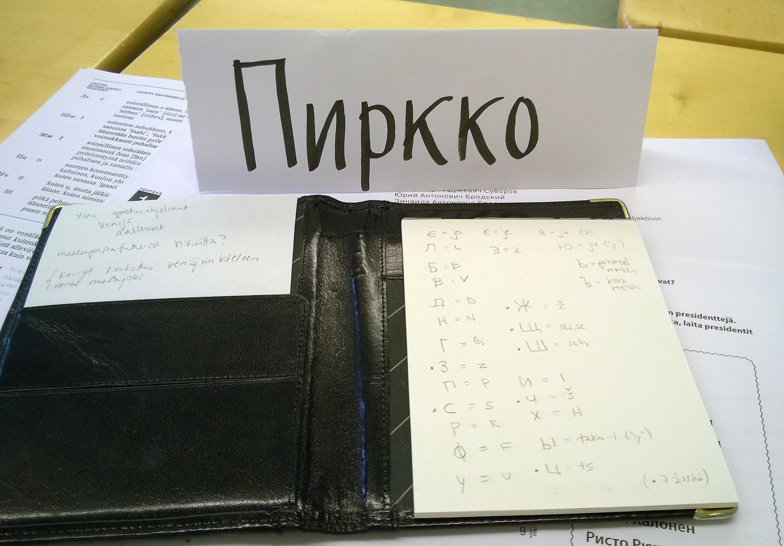 Tällä kertaa päätimme myös opetella kevyesti kieltä matkaa varten – todellakin vaan kevyesti, sillä asetimme päämääräksi oppia kyrilliset kirjaimet ja osallistuimme siksi viikonloppuna Helsingin työväenopiston viikonloppukurssille, jossa ne käytiin läpi. Kirjainten nopeatahtisen läpikäynnin lisäksi emme voineet välttyä oppimasta muutaman sanan venäjää ja hiukan esimerkiksi venäläisistä nimistä.