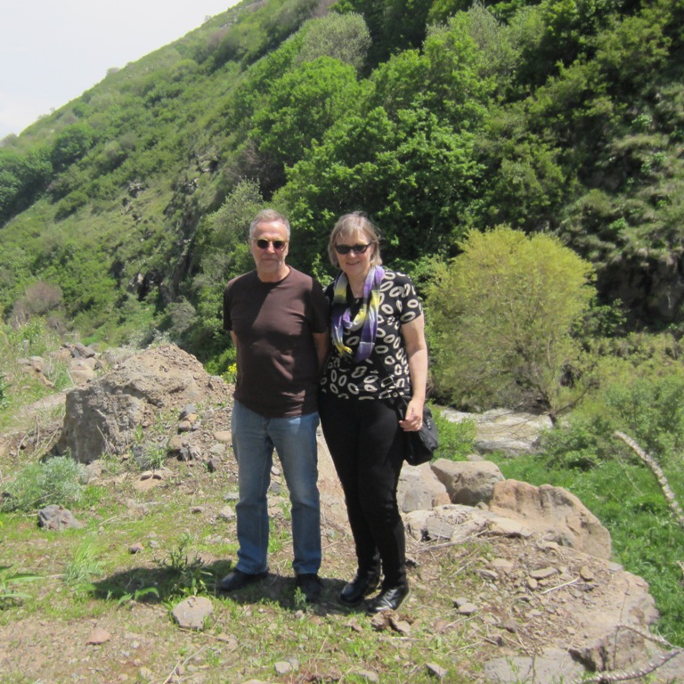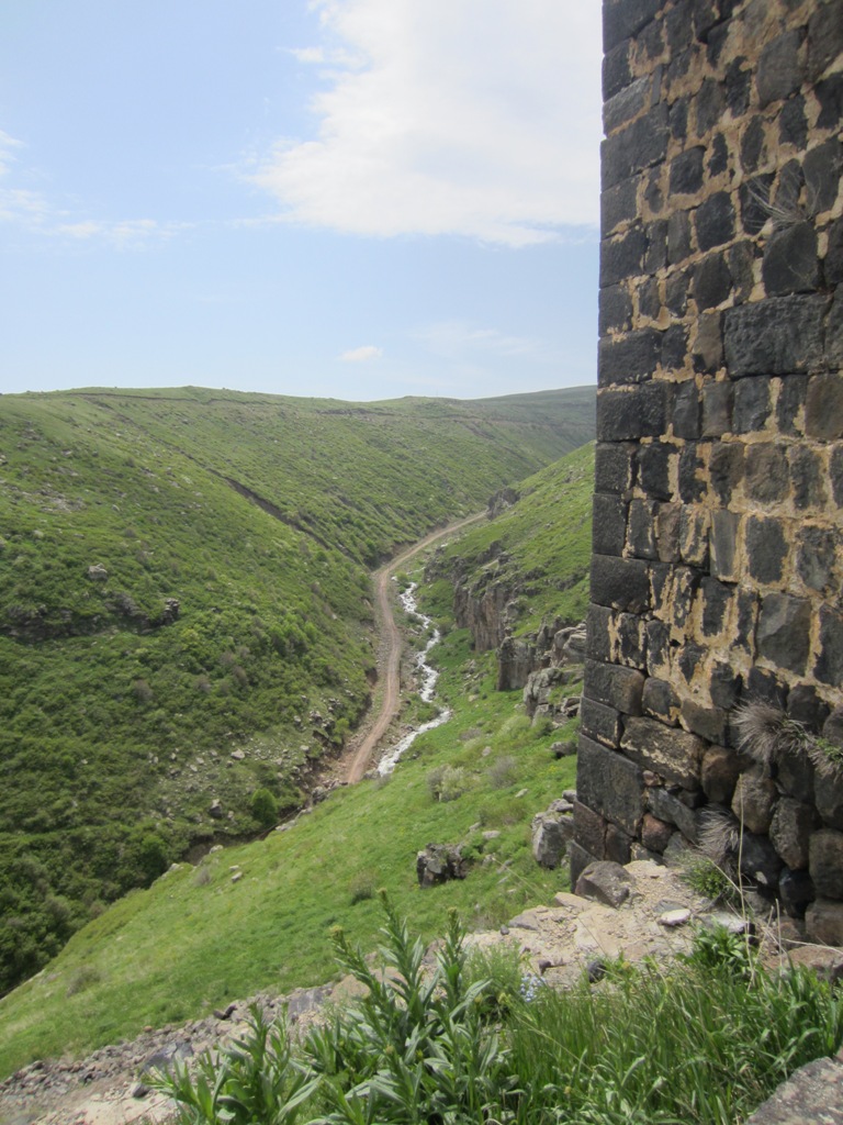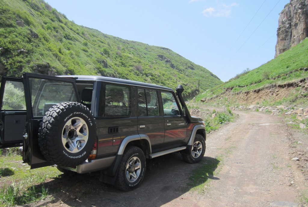 Retken idea ja toteutus tuli Lassen Yerevanissa jo muutamia vuosia asuneelta ex-kolleegalta ja niinpä sitten lähdimme puoliltapäivin hotellistamme, me, matkaseurueeseemme kuuluva toinen “maailmanmatkaaja” -pariskunta ja Lassen ystävä armenialaisen vaimonsa kanssa offroad-ajeluunkin sopivalla jeepillä kiipeämään kohti Aragats-vuoren huippua. Tai ei nyt ihan huippua, kohteena oli n. 3 kilometrissä sijaitseva ravintola. Ja ryhmäämme kuului myös jeepin kuljettaja – nämä tiet eivät ole amatööreille. Menomatkan teille kauniin rotkon kautta, tietä pitkin, joka haastavuudessaan ylitti Afrikassakin kokemamme, mutta kuljettaja osasi asiansa ja maisemat olivat pienen rynkytyksen arvoisia. Puolimatkan krouvina pysähdyimme hetkeksi Amberdin vanhalle linnoitukselle, josta matka jatkui ylöspäin ihan normaalia asvaltoitua tietä – mutta hyvin mutkainen ja kuoppainen sekin oli!