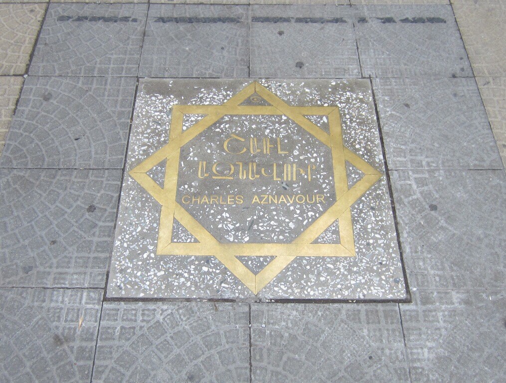 Aloitimme hotelliltamme, joka sijaitsi Charles Aznavour -aukion laidalla – ja siinähän se oli, Hollywood-tyyliin, laatta armenialaiselle kuuluisuudelle, Moskva-elokuvateatterin edessä. Tässäkin oli ennen kirkko, mutta neuvostovallan aikaan sen tilalle tuli tämä elokuvateatteri.