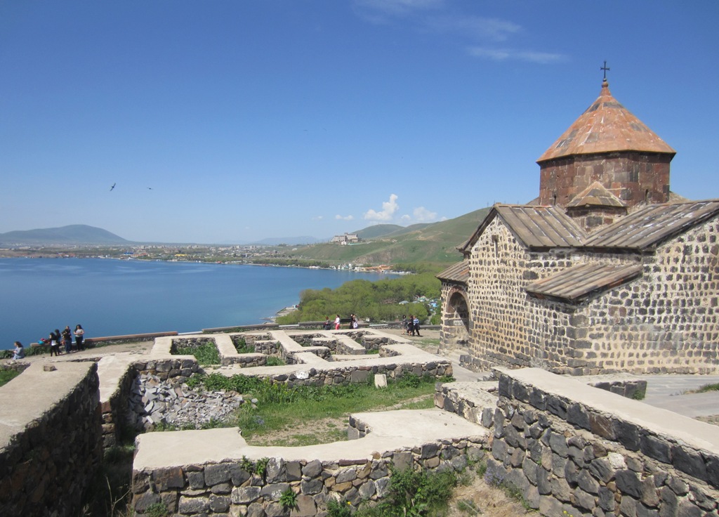 Sevan-järvellä nousimme 200 askelmaa Sevanavankin luostariin, josta oli hyvät näköalat järvelle ja joka luostarinakin oli mielenkiintoinen, sillä tähänkin löytyi tietysti tarina.