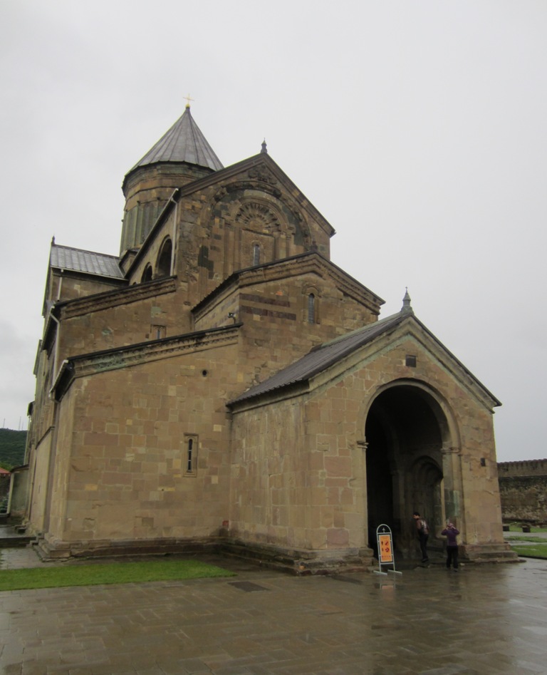 Mtskhetan keskustassa oleva Svetitskhovelin katedraalin alue on jo kunnon turistirysä, viini- ja matkamuistomyymälöitä on matkalla kirkolle useita, vaikka sateessa osa niistä on sentään kiinni. Tähän kirkkoon kuuluu tarinat Kristuksen vaatekappaleesta, joka on haudattu kirkon alle. Arkkipiispan tuoli keskellä kirkkoa on juhlava, mutta sitä ei saa kokeilla, kun ei satu olemaan arkkipiispa. Täällä kirkkoon mennäkseen naisten on jo pukeuduttava paitsi huiviin myös hameeseen – Armeniassa edes huivilla ei ollut niin väliä, Georgiassa huivi on pakollinen ja näköjään tärkeimmissä paikoissa myös hame.