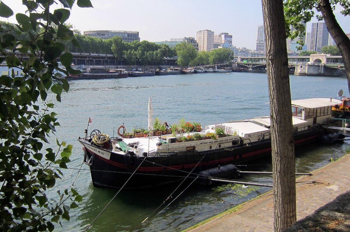 Trocaderolta jatkoimme Seinen rantaa Ile des Cygnesin suuntaan. Halusimme nähdä täkäläisen kopion Vapaudenpatsaasta. Kävelyretken bonuksena näimme Seinen rannan asuntolaivoja, puutarhoineen!
