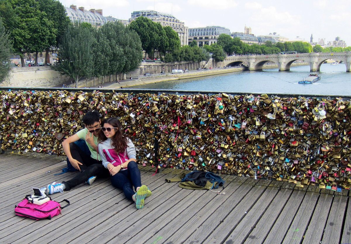 Viimeinen päivän listanne kohde oli Pont des Arts. Kävelimme hitaasti Seinen rantaa sinne päin rannan kirjakojuja katsellen – nämä lienee osa sitä Seinen rantaa, joka on Unescon maailmanperintökohteeksikin nimetty. Hiukan ennen Pont des Artsia kohujen tarjonta levenee käsittämään myös lukot. Ja itse silta on sitten niitä todella pullollaan. Jos viime aikoina on maailmalla käyty jonkin verran keskusteluja siitä, että pitäisikö näitä lukkoja poistaa suosituilta silloista vaarallisina rakenteille vai ei, niin ottamatta siihen kantaa voisin kuitenkin kannattaa sitä, että lukkoja ei saisi myydä sillalla, vaan ainakin siltaan kiinnitettävät lukot pitäisi olla etukäteen hankittuja ja teon siis kunnolla harkittu ja oikeasti merkityksellinen, ei hetken päätös sillalle sattumalta osuttaessa! Ja täälläkin, tietysti, selfie-kuvaajia riitti – myös ihan kameralla ja tarkalla sommittelulla.