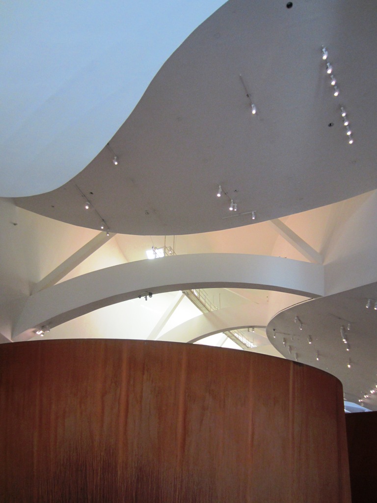 Lounaan vahvistamana jaksoimme sitten jo innostua Itse museostakin. Syyskuisena lauantaina jonoja ei ollut ja muutenkin museossa oli kivan väljää. Kun museo rakennuksena on saanut niin paljon julkisuutta, niin emme etukäteen olleet ottaneet yhtään selvää näyttelyistä, mutta oikeastaan oli kiva yllättyä. Yllättyä Richard Serratin metallisissa spiraaleista ja labyrinttimaisista käytävistä – negatiivisesti, ne olivat aika tylsiä. Ja Ragnar Kjartanssonin videoinstallaatiota positiivisesti: tusinan verran tunnelmallisia videoscreenejä muutaman huoneen kaikilla seinillä, ihmiset videoilla soittavat eri instrumentteja ja olet kuin tuon konsertin keskellä. Muut teokset jäivät sitten jonnekin näiden välimaastoon ja etenkään “tavalliset” maalaukset eivät tässä museossa oikein jaksaneet innostaa!