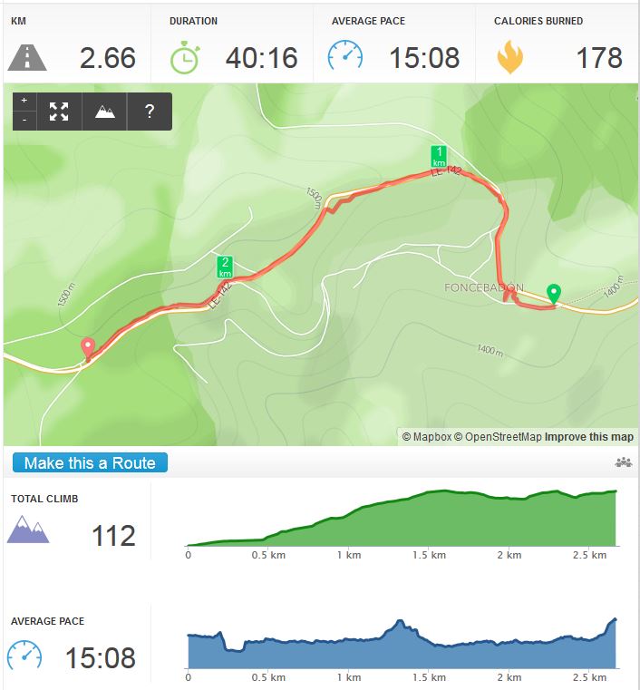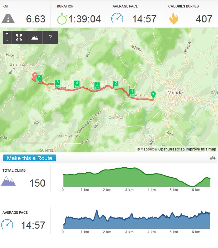 Kävelyosuudet pieninä karttoina kilometri, minuutti, nousumetrit ym. tietoineen alla – klikkaa kuvia suuremmaksi nähdäksesi ne – ensimmäisenä päivänä (15.9.) menimme näköjään puolijuoksua – sittemmin otimme rauhallisemmin ja otimme jopa joitakin valokuvia reitin varrelta!