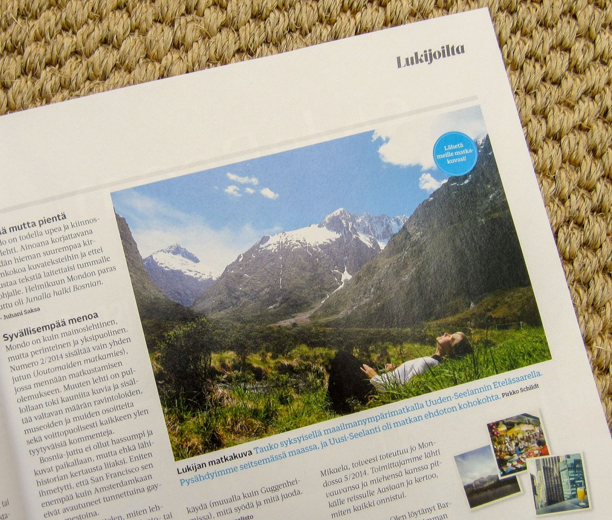 Mondo-lehden 30.10. ilmestyvän numeron Kosmopoliitti -sarjan henkilönä olen minä! Toimittaja Satu Kärki haastatteli minua aiheesta maabongaus syyskuun alussa lähes pari tuntia ja valokuvaaja Jussi Särkilahti kävi ihan kuvaamassa minua tuossa naapurissa Haukilahden rannalla. Toivoivat lisäksi juttuun kuvaa “kotialbumista” ja kun ensiksi tarjosin mielestäni mukavaa kuvaa Uudesta Seelannista, niin pyysivät toista, kun tämä kuva on kuulemma jo Mondossa julkaistu aikaisemmin!
