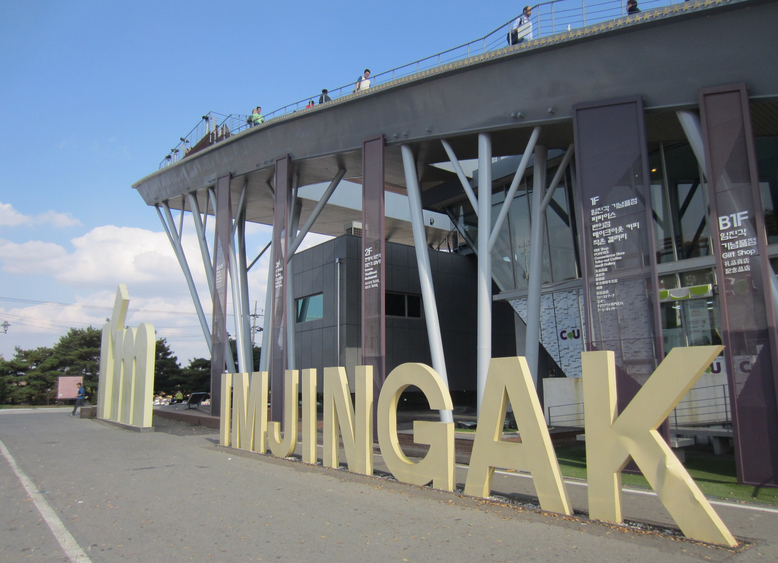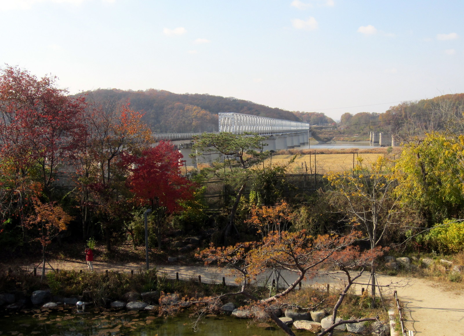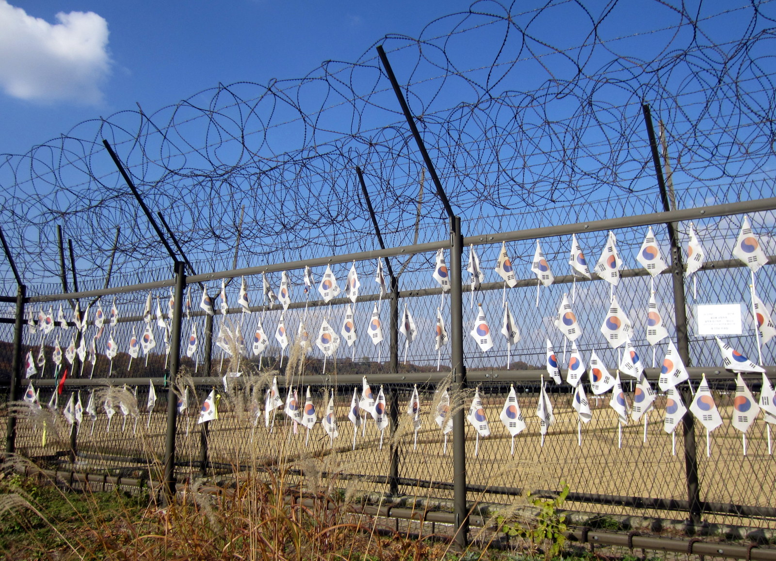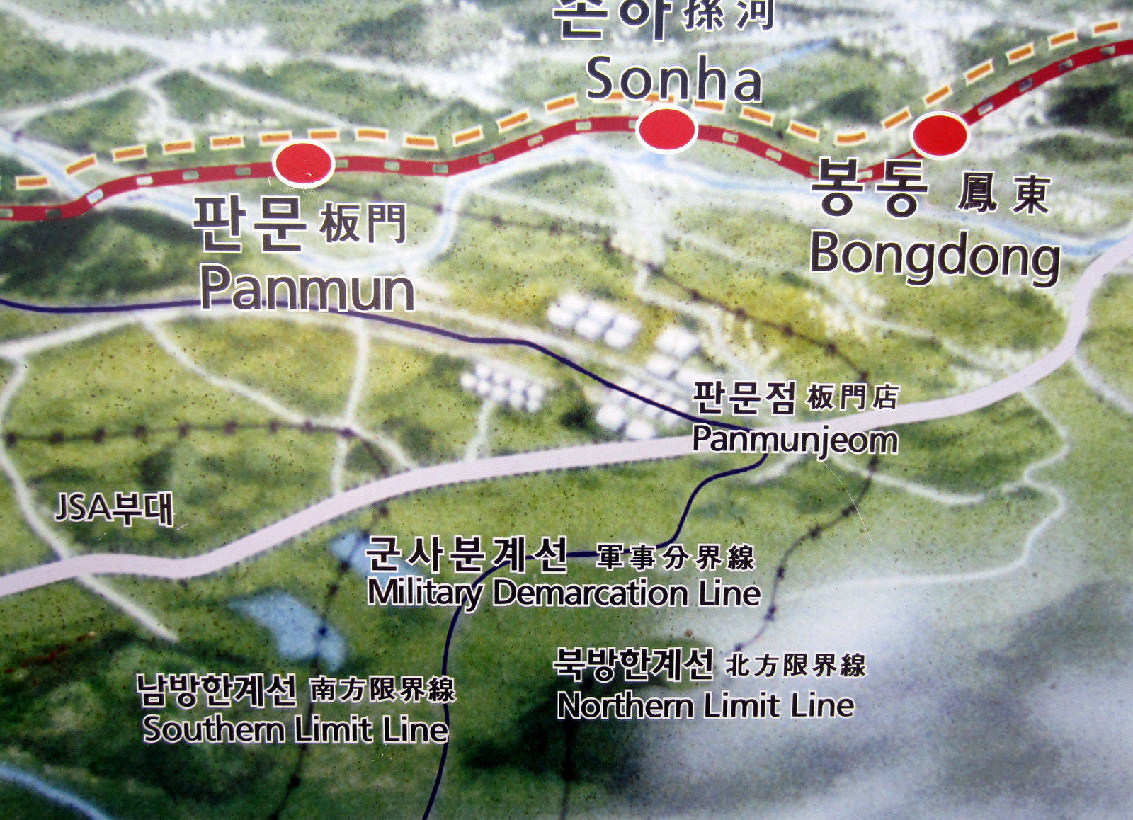 Matkalla näimme myös miten rajalle menevää tietä reunustaa korkea piikkilanka-aita, jossa on säännöllisin väliajoin vahtitorneja – tie kulkee joen rantaa pitkin ja joen toisella puolella on Pohjois-Korea. Tien yllä on rajaa lähestyttäessä tihenevin välein tukevia betonisiltoja, joissa on mainostauluja – nämä ovat oikeasti siltoja, jotka räjäytetään alas tukkimaan tietä, jos Pohjois-Korean tankit tulisivat rajan yli. Opimme myös, että Hangang -joen ylittää 29 siltaa ja lisää on rakenteilla, näin paitsi liikenteen sujuvuuden takia, myös siksi, että mahdollisessa sotatilanteessa kaikki sillat eivät tuhoutuisi kovin helposti. Pohjois-Korean puolella kukkulat ovat paljaita – puut on katkottu, jotta mahdollinen liikehdintä kukkuloilla näkyisi. Sitten vuoden 2004 kukkuloilla puolin ja toisin ei enää ole ollut iskulauseita ja kummankin puolen kovaääniset ovat hiljenneet – sitä ennen maat kilpailivat näiden tehossa.
