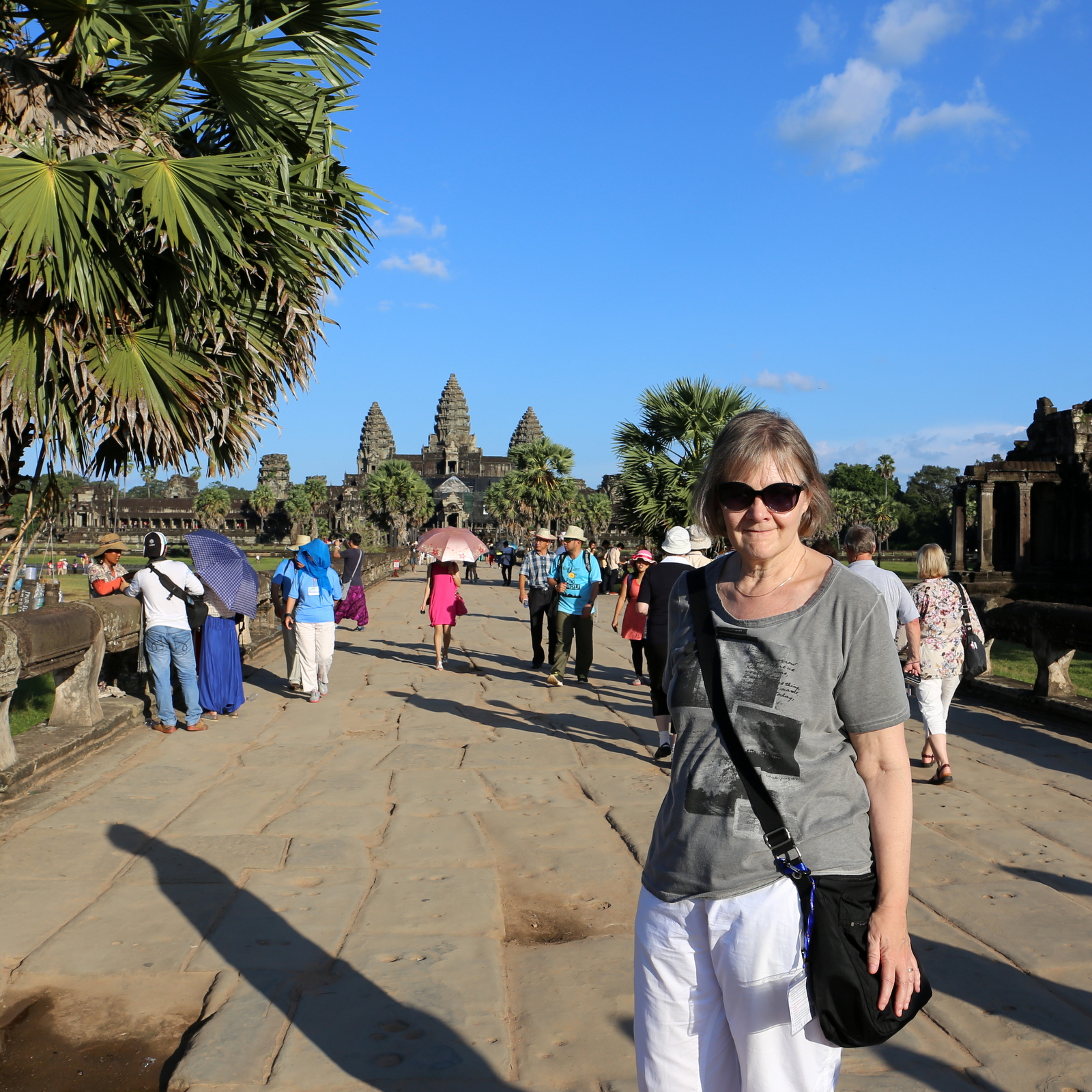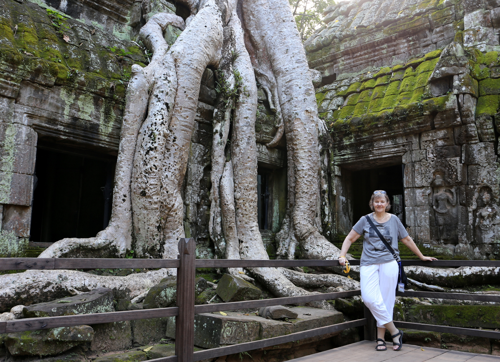 Aloitimme Ta Prohm -temppelistä, jossa puut kasvavat myös temppelien päällä ja mahtavien kapokkipuiden juuret syleilevät raunioita. Tämä kuningas Jayavarma VII:n äidilleen 1100-luvulla rakentama temppeli oli myös elokuvan Tomb Raider näyttämönä, Angelina Jolien esittäessä pääosaa – temppelille pääss nykyisin myös pyytämällä kyydin Angelina Jolie -temppelille.
