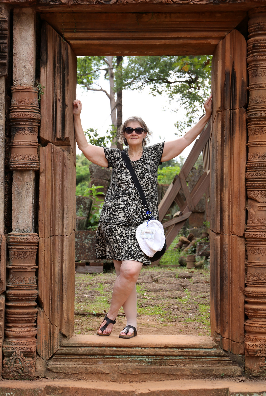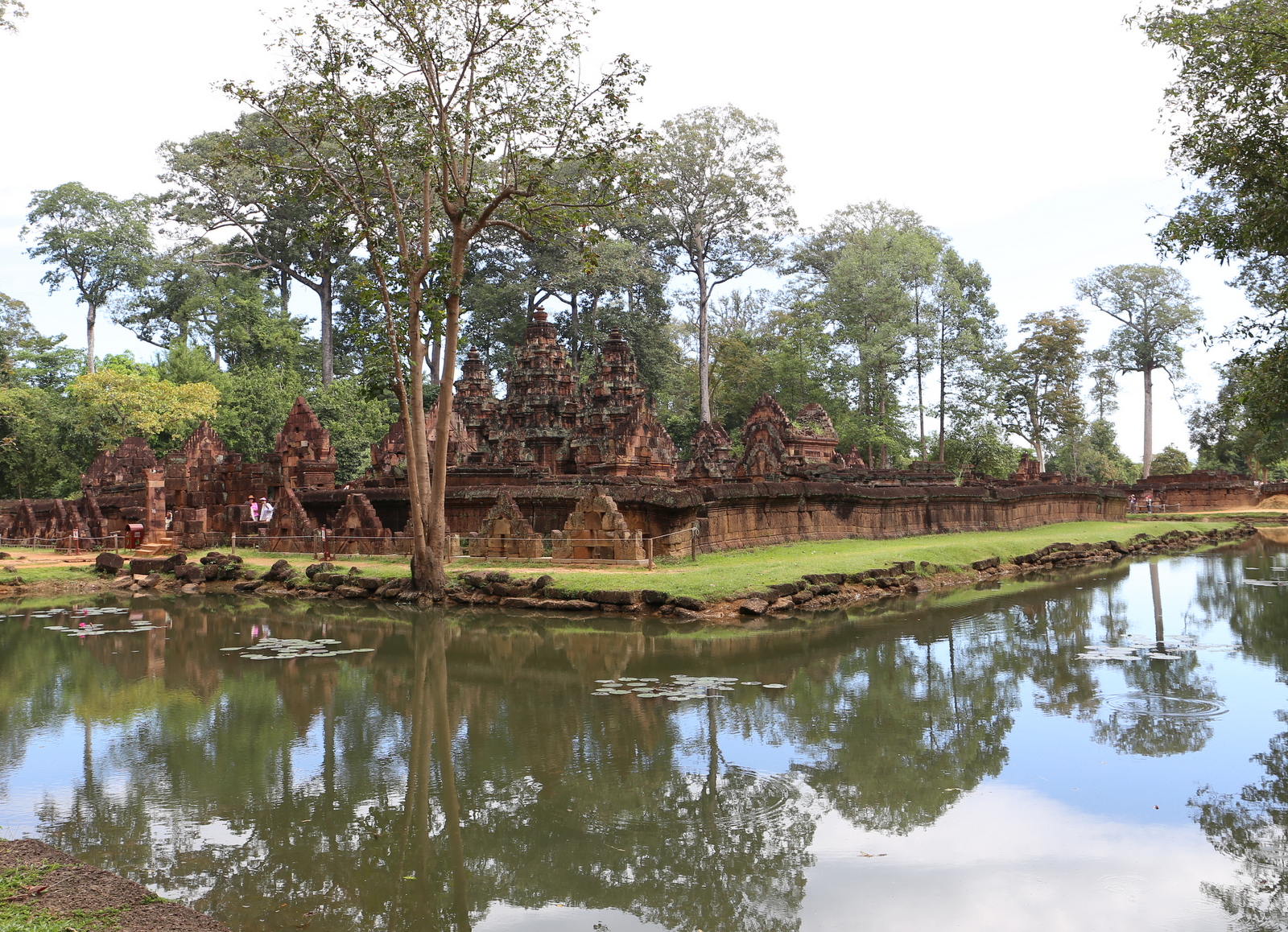 Banteay Srey -temppelillä, naisten temppeliksi kutsutulla, käymme toisen Siem Reap -päivämme aamuna. Naisten temppeliksi sitä kutsutaan, niin nimensä kuin sen koristelujen pitsimäisen herkkyyden takia. Banteay Srey on Angkor Watiin ja Ta Prohmiinkin verrattuna pieni ja sijaitsee 38 km Siem Reapistä. Punaisesta hiekkakivestä 1100-luvun lopulla rakennettu temppeli on kuitenkin ihan omanlaatuisensa ja sellaisena vierailun arvoinen. Rakennusten päätykolmioissa voi nähdä näitä pikkutarkkoja kuvia ja temppelin pihalla apinoiden ja apsara-tanssijoiden patsaita. Tämäkin temppeli on vallihaudan ympäröimä, mutta vallihautakin on tietysti pienempi eikä Angkor Watista kaikkien tyypillisesti ottamaa heijastuskuvaa oikein saa – tai jos vaikka jossain määrin saisikin, niin alueen turistimassat viimeistään pilaavat ne. Tännekin olisi pitänyt lähteä aamukuudelta, eikä vasta klo 9.