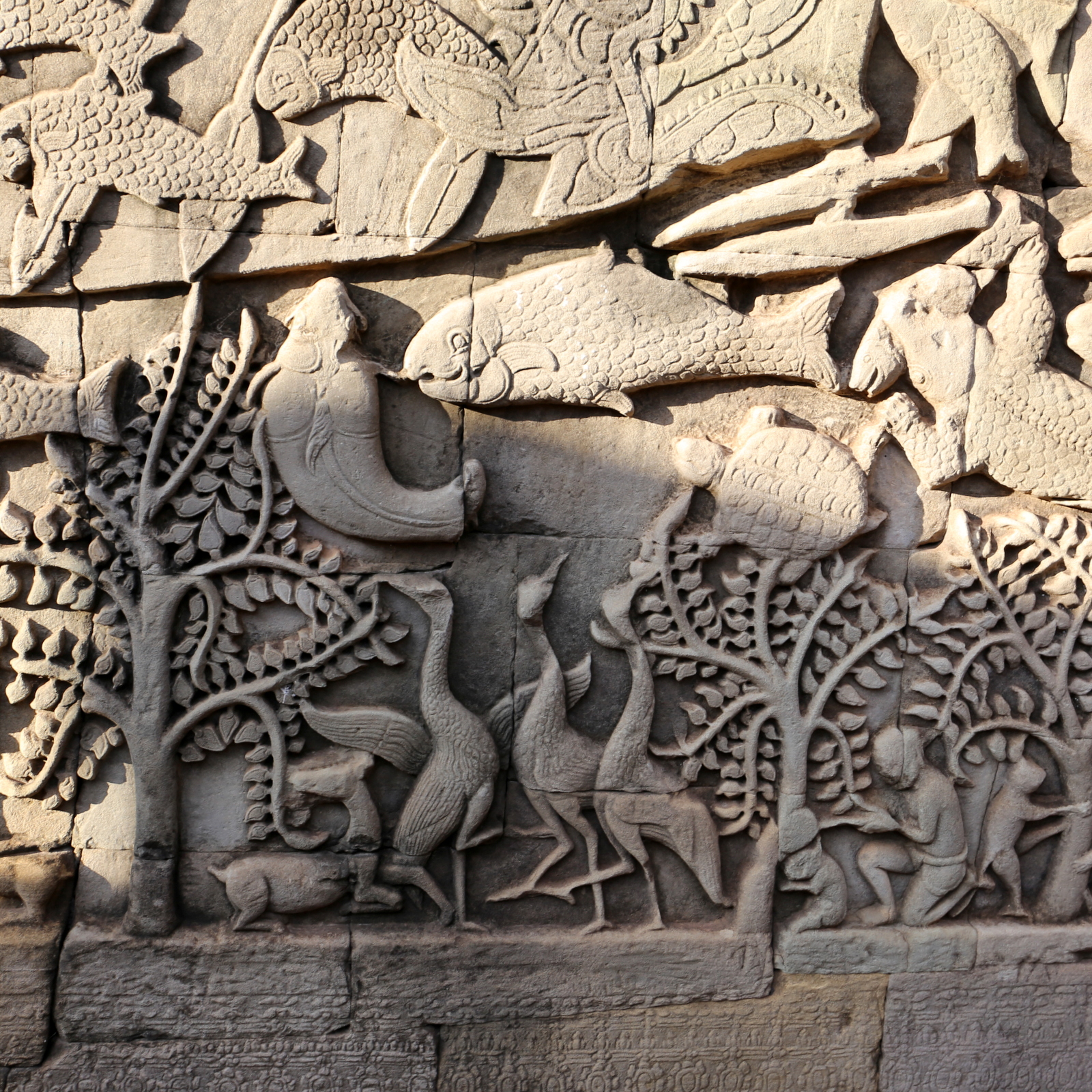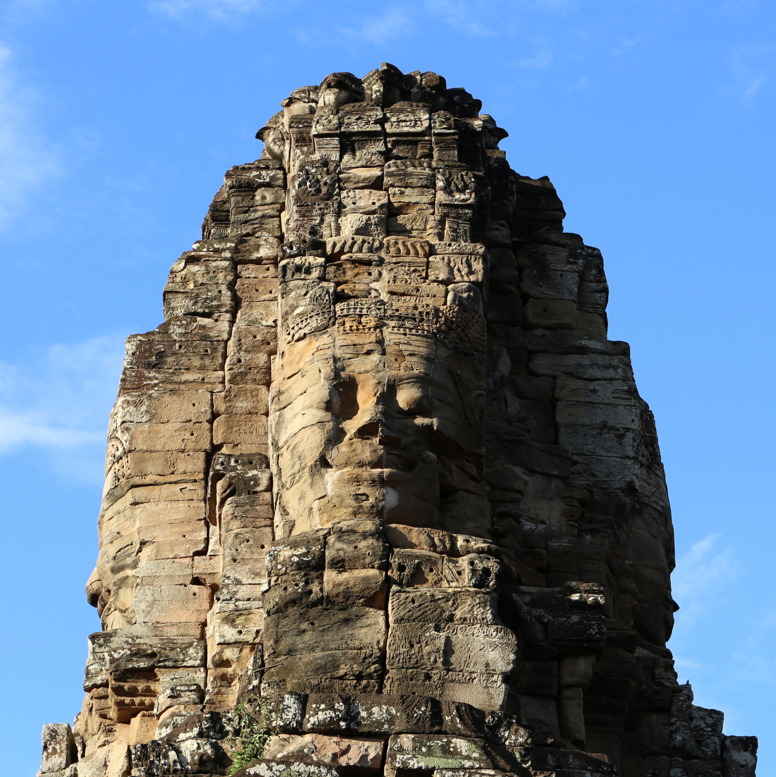 Myös Bayonista “kuuluu” ensin ottaa kuva, jossa temppeli myös heijastuu sitä ympäröivään vallihautaan, paikallisopas näyttää kiven tarkkuudella, että tästä kohtaa saa parhaan kuvan. Seuraavaksi Bayonissa huomio kiinnittyy sen lukuisissa torneissa oleviin isoihin kasvokuviin – temppelialueen jäljellä olevissa 37 tornissa on edelleen n. 200 kasvokuvaa. Kasvokuvien lisäksi Bayonissa on erityisen rikkaita ja isoa reliefejä, metri toisensa jälkeen tarinoita menneisyydestä kaiverrettuna seiniin. Tuhansista niistä erotettavissa olevista yksittäisitä kuvista kurkien tanssi kuulemma ehkä kuuluisin. Myös täällä kiipeämme ylös temppelin keskelle – ei niin korkealle kuin Angkor Watissa, mutta päivän portaat kuitenkin. Ylös johtavien portaiden löytäminen, kun ensin kiertelin temppeliä hiukan sivummalta, enkä kävellyt suoraan siääntuloköytövöä eteenpäin meinasi muodostua ihan oikean reitin löytämiseksi labyrintissa, mutta löytyihän se lopulta! Lassekin oli palannut pääreitille, joten tunsin välillä olevani oikeasti yksin ja eksyksissä harmaassa kivilabyrintissa – harvinaista kyllä Bayonissa oli tosi vähän muita turisteja käyntimme aikana.