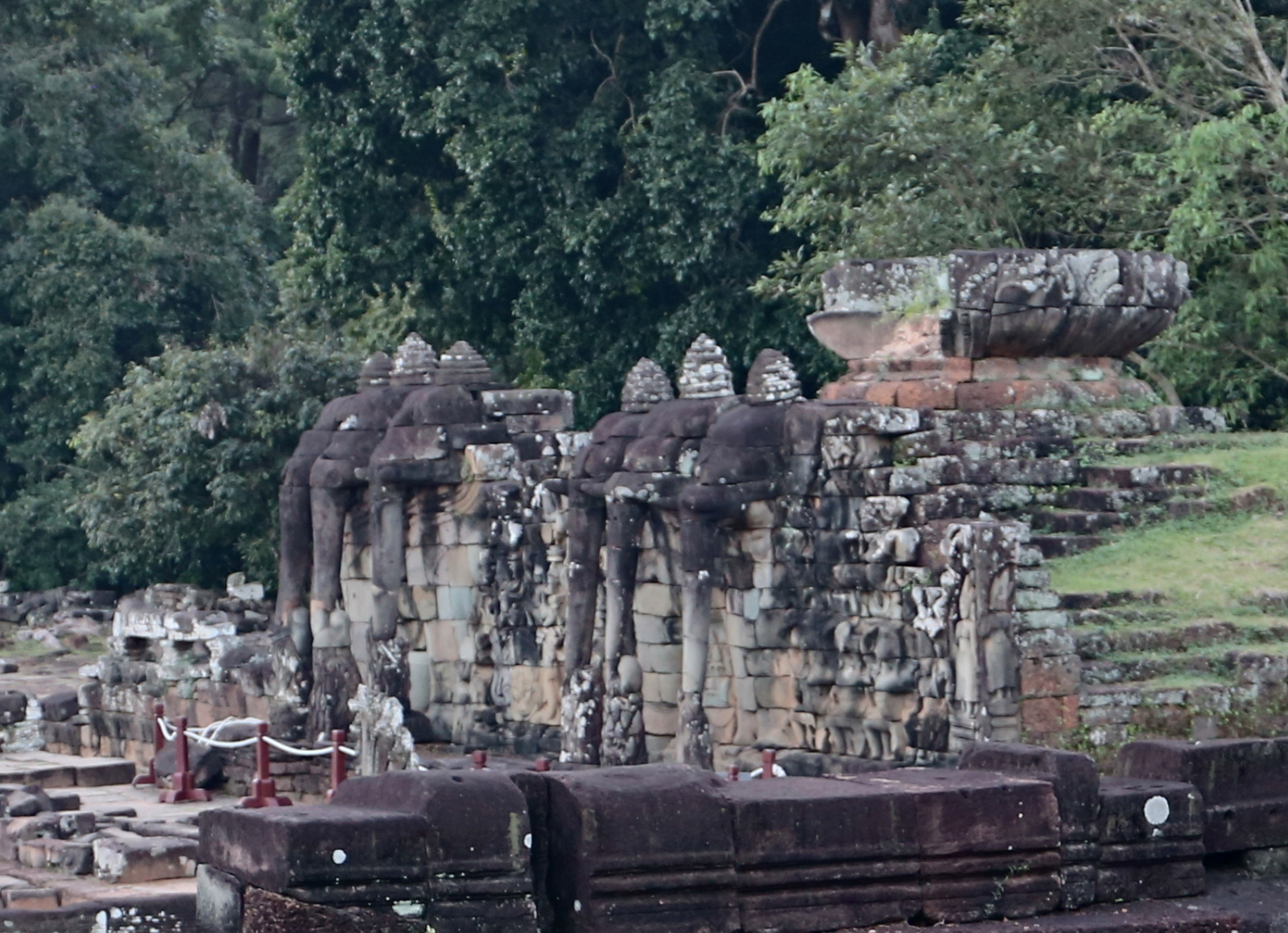 Lopuksi ennen Angkor Thomista lähtöämme katselemme vielä samanlaisia elefantteja elefanttiterassilla ja kuljemme rikkain reliefein koristeltua labyrinttia pitkin leprakuningasta katsomaan. Kuninkaalla ei ole varsinaisesti mitään tekemistä lepran kanssa, mutta kun patsas aikojen kuluessa särkyi siten, että se menetti sormiaan ja varpaitaan, niin sitä ruvettiin kutsumaan leprakuninkaan patsaaksi.