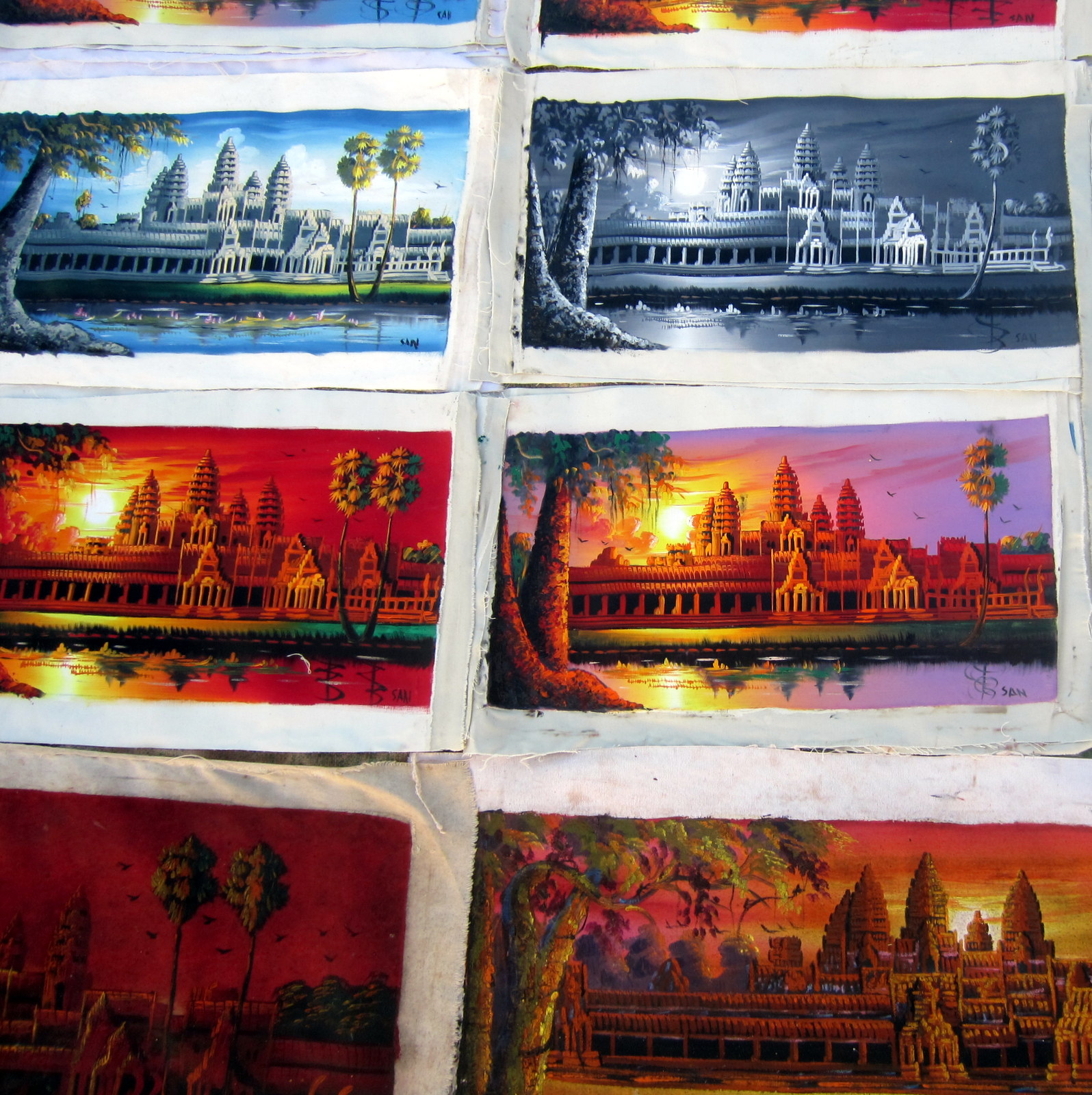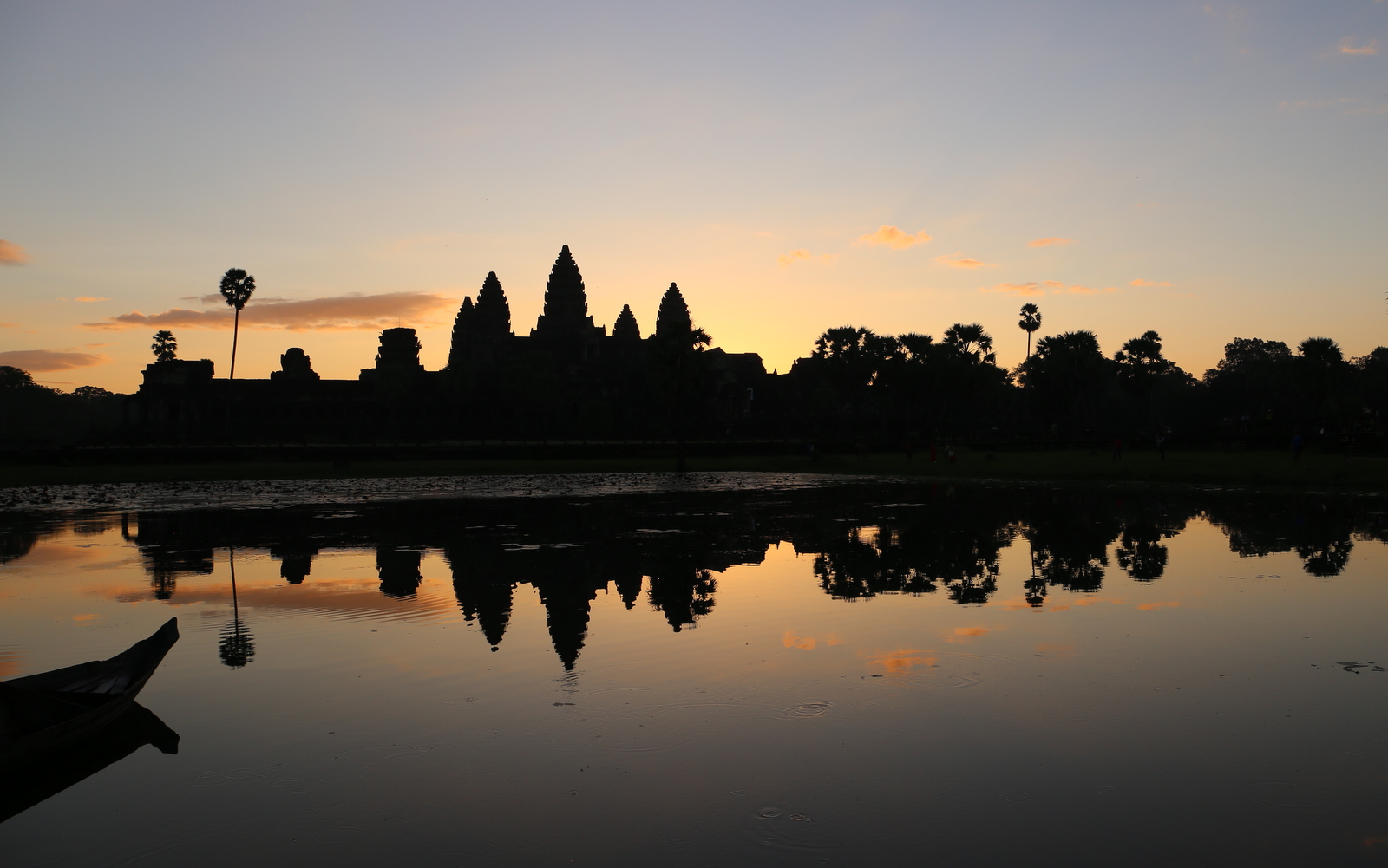 Hitaasti, hitaasti taivas vaalenee Angkor Watin kolmitornisen siluetin takana. Jokainen hetki – tai ainakin muutaman minuutin välein – maiseman värisävyt vaihtuvat sen verran, että “kannattaa” ottaa vielä yksi kuva. Yksi kuva siten, että lammella kelluva ruuhi on mukana kuvassa. Yksi ilman sitä. Yksi Angkor Watin edustalla käyskentelevän hevosen kanssa. Muutama (kymmenen) kuvaa lahtea ympäröivästä ihmismuurista – tai ihmisistä, jotka ovat kiivenneet pienen temppelin raunioille. Tai rannalla erilaista festivaalitavaraa tarjoavista myyjistä: tarjolla on vaatteita, maalauksia, puhvelinnahasta leikattuja varjokuvia, postikortteja, aamiaista.