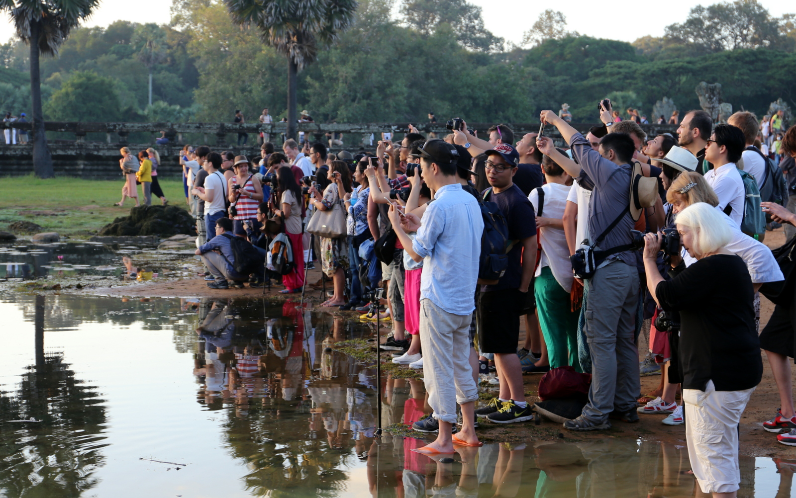 Emme kuitenkaan joutuneet jatkamaan matkaa yksin – auringonnousua Angkor Watilla ihailemaan oli menossa väkeä enemmän kuin siellä oli väkeä ensimmäisenä päivänä ryhmän kanssa tekemällämme retkellä. Ja vaikka oli edelleen pimeää, niin olimme tavallaan hiukan myöhässä päästyämme lootuslammen rannalle, paikat veden partaalla oli viety jo aikaa sitten. Onneksi olemme pitkiä!