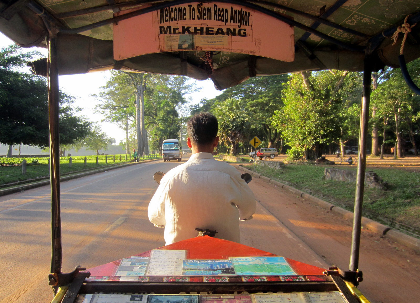 Kun mopon vetämä sohvamme lähti hotellilta Angkor Watin alueelle oli vielä pimeää ja miellyttävän viileää. Liikkeellä oli lenkkeilijöitä otsalamppujensa kera, Angkor Watille myös suuntaavia pyöräilijöitä ja tietysti paljon näitä sohvakulkuneuvoja. Angkor Watille vievälle sillalle saavuttuamme kuljettajamme kertoi odottavansa meitä parkkipaikalla oikealla ja korosti nimeään, Mr. Kheang, joka myös luki hänen ajoneuvonsa kyljessä.