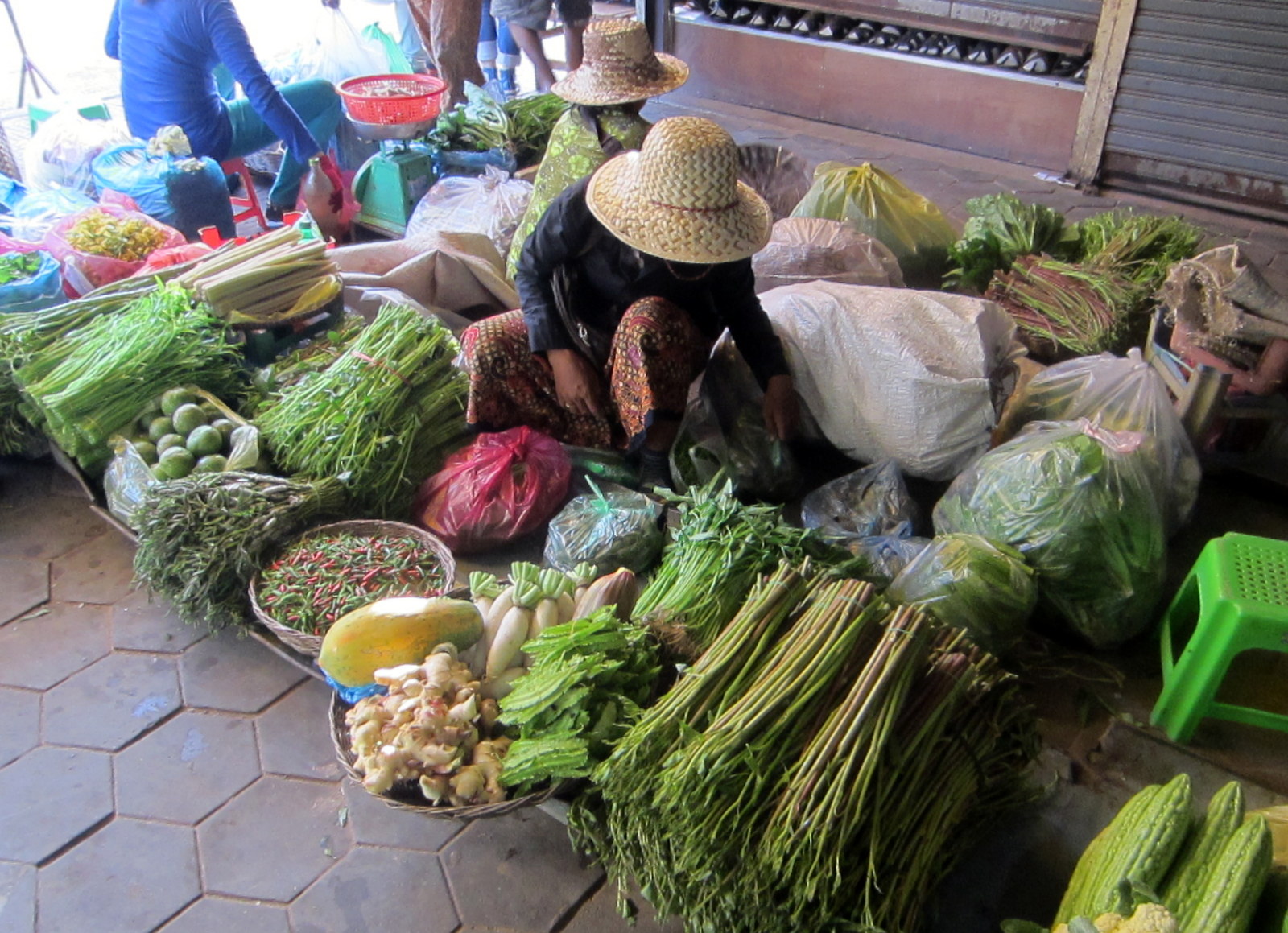 Pysähdymme vielä hetkeksi aamumarkkinoille, jotka ovat vasta alkamassa ja kierrämme mielenkiintoisimmat, eli liha-, viihannes- ja hedelmätiskit. Kanojen jalkoja myydään nipuissa, siis ei reisiä vaan varpaita. Hedelmätiskeillä on tarjolla meille viime viikkoina tutuiksi tulleita pomeloita, rambutaneja ja lohikäärmehedelmiä muiden jo entuudestaan tutumpien lisäksi. Mutta kuten käytännössä aina markkinoilla otamme vain kuvia, emme osta mitään – olemmehan palaamassa hotellille aamiaiselle. Kello ei ole vielä kahdeksaakaan. Hedelmälepakot ovat palanneet öisiltä retkiltään hotellin vieressä olevan puiston puiden latvuksiin. Angkor Watin kolmen päivän lippumme on käytetty “loppuun”.