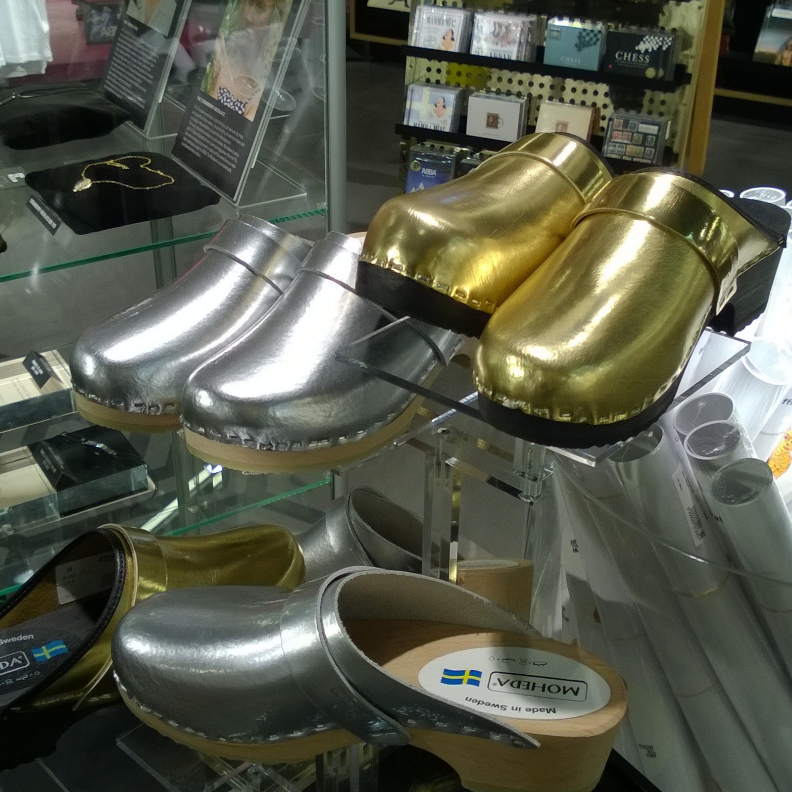 Museokaupassa oli tarjolla kaikenlaista Abba-aiheista kamaa, mutta emme kokeneet tarvitsevamme kullanvärisiä puukenkiä tai Abban opasta Tukholmaan.