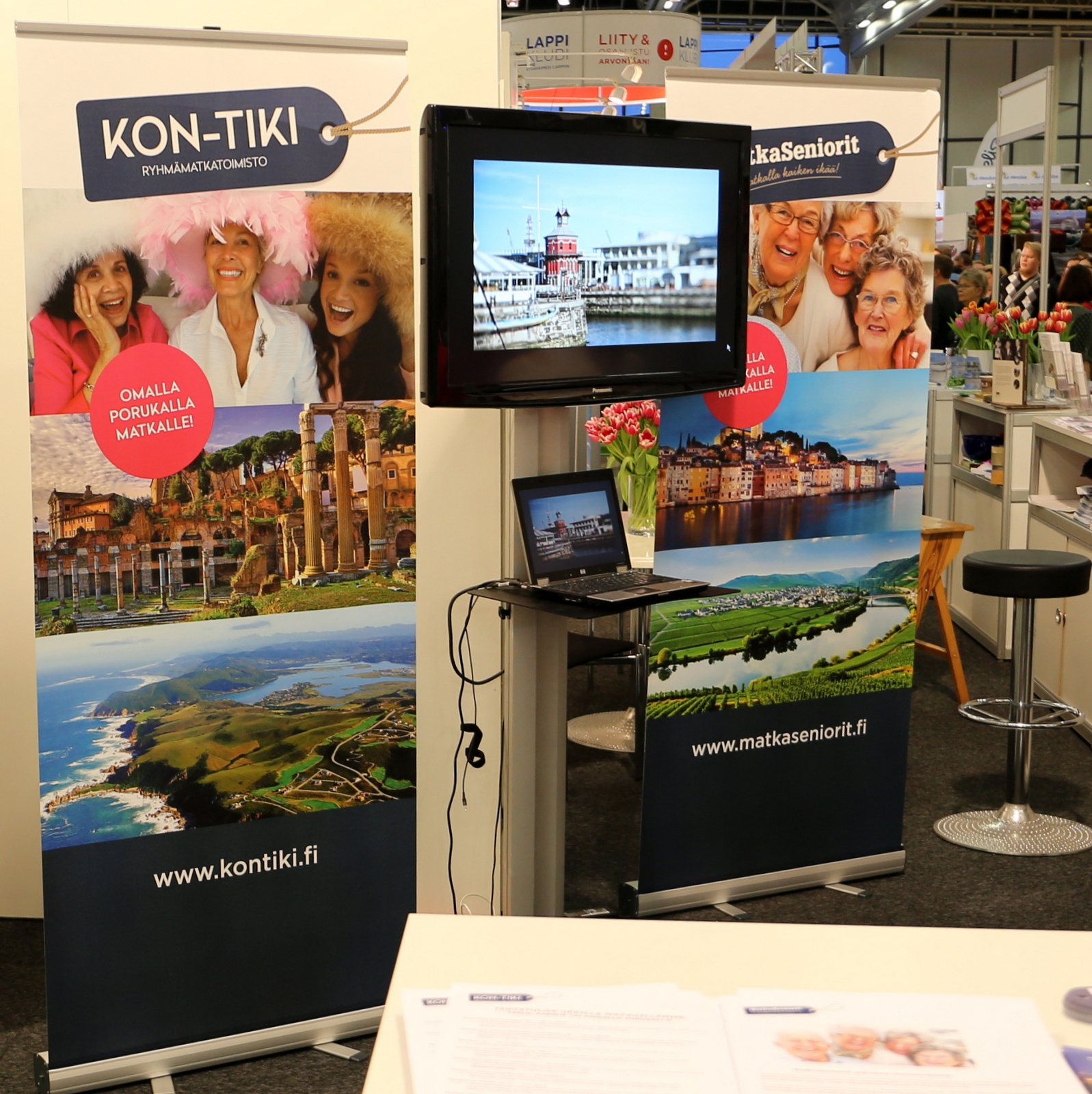 Toki kävimme katsomassa Kon-tiki -toimiston osaston myös matkamessuilla – esittelyjällä oli hymy herkässä ja esitteet tekivät kauppansa messuvilinässä.