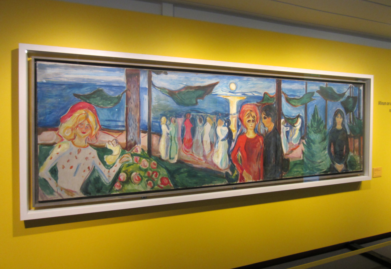 Omat suosikkini näyttelyssä olivat teokset Verannalla vuodelta 1902 ja pieni Koira-teos vuodelta 1927 – kumpikin iloisia ja valoisia teoksia, siis hiukan vähemmän tunnettua puolta Edvard Munchista.