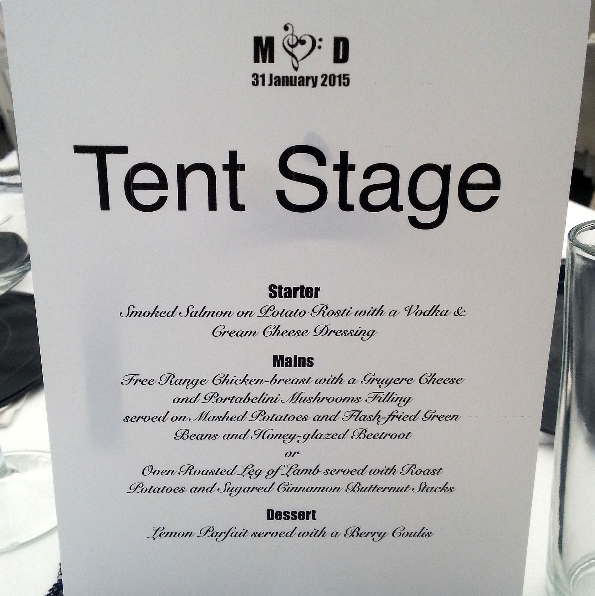 Ruokailu järjestettiin katetussa tilassa pöytiin tarjoiltuna. Pöytäkoristelussa oli otettu myös mukaan musiikkiteemaa pienillä erilaisilla yksityiskohdilla. Ruokailussa oli myös otettu mukaan molemmat maat, sillä ruokailun alkuun vieraille tarjottiin shotit: suomalaiset saivat amarulaa ja etelä-afrikkalaiset saivat maistaa salmiakkikossua. Pienen gallupin jälkeen sain tulokseksi 50/50 salmiakkikossusta, maku ei ollut kaikkien mieleen, mutta fanejakin löytyi.