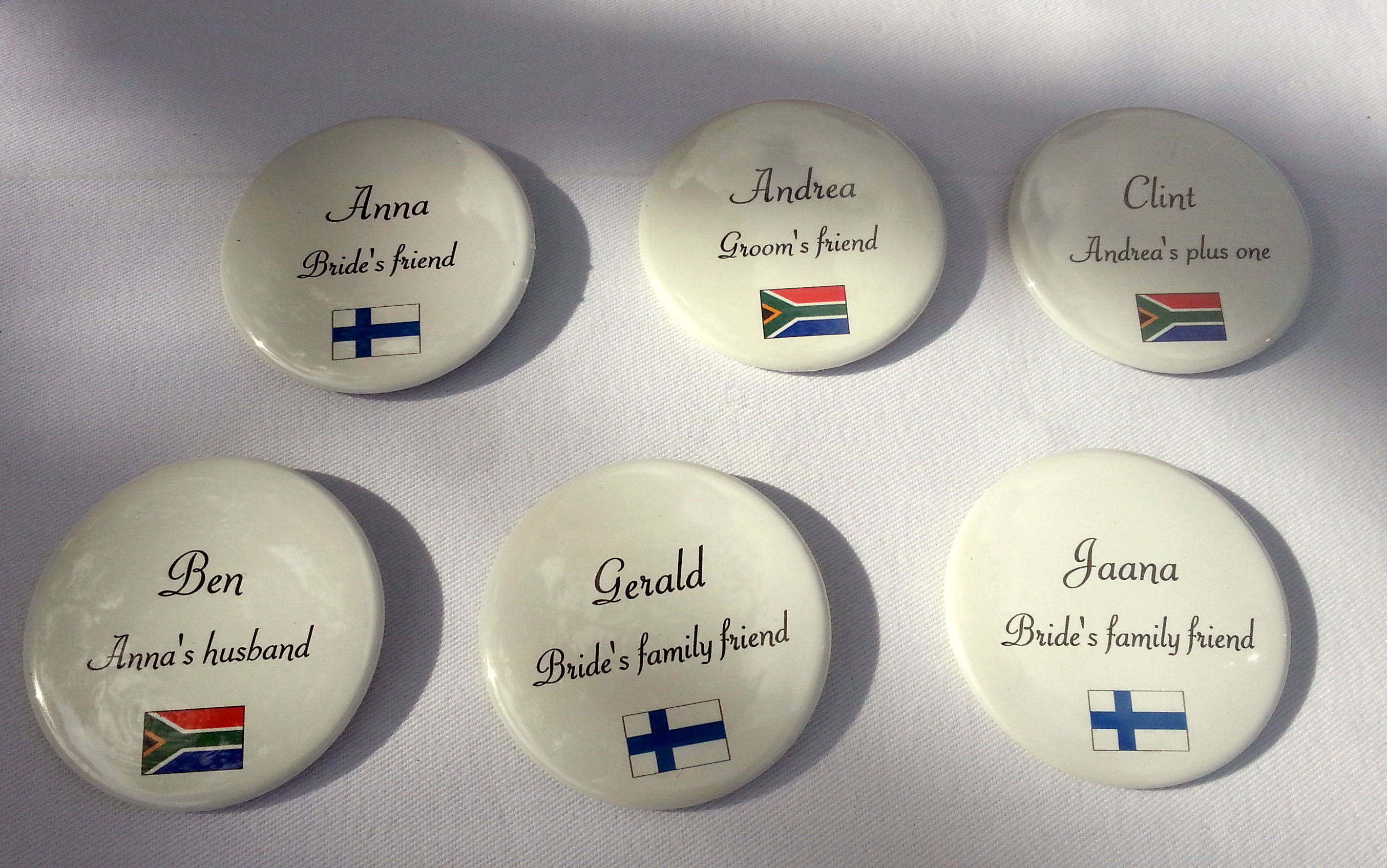 The wedding ceremony was outside under the late afternoon sun. The actual ceremony was shorter and much more relax compared to the Finnish one. In the ceremony the minister also read a speech from the grandfather of the bride because the grand parents did not participate the wedding in South Africa. After the ceremony we all got champagne and it was time to take some photos and get to know the guests. All the guests got buttons which had the guest’s name and the country they were from and also how did the guest know the bride or the groom. Before the ceremony all the guests also got a small rice bag which is typical from Finnish wedding but also not so typically a sun glasses which were used to take group photos.