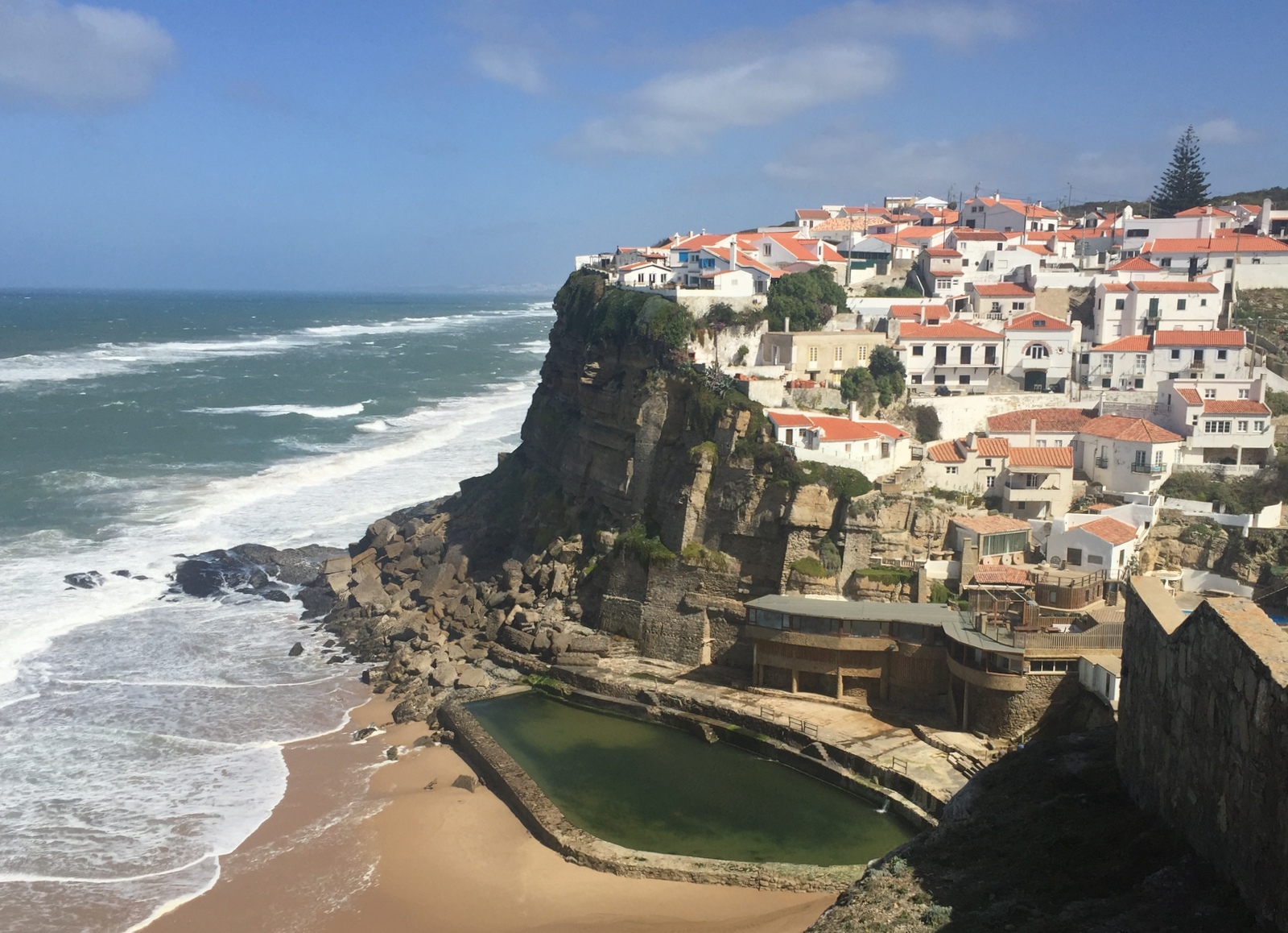 Matkalla Capo da Rocaan pysähdyimme Praia das Macas -nimiselle kauniille rannalle Atlantin tyrskyjä ihailemaan ja kävimme katsomassa korkealla kallion päällä olevaa Azenhas do Mar -nimistä kylää, jonka alapuolella, meren rannalla on vanha merivesiuima-allas. Samalla saimme esimakua tuulen voimakkuudesta.
