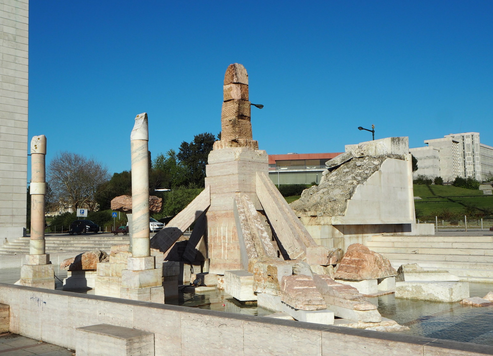 Aloitimme lyhyellä pysähdyksellä Eduardo VII:n puistossa, jonka yläosasta näkee yli Lissabonin. Opas esitteli meille myös vähän sekalisen marmoriläjän näköisen patsaan, joka kuulemma kuvaa vuoden 1974 vallankumousta, mutta se ei meitä oikein vakuuttanut, ainakaan näin kuiviltaan.
