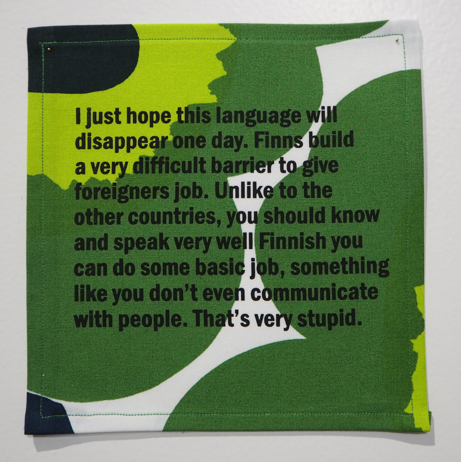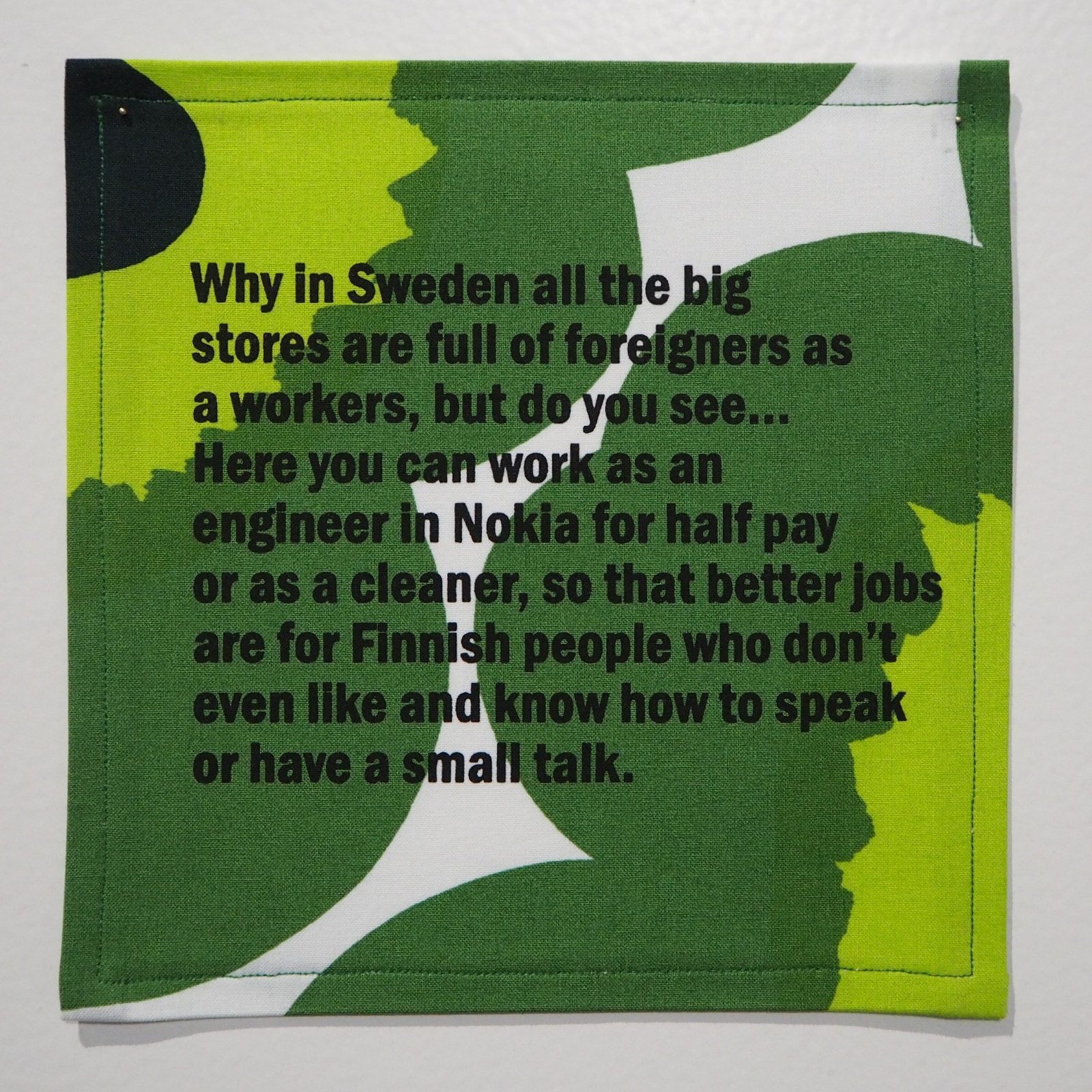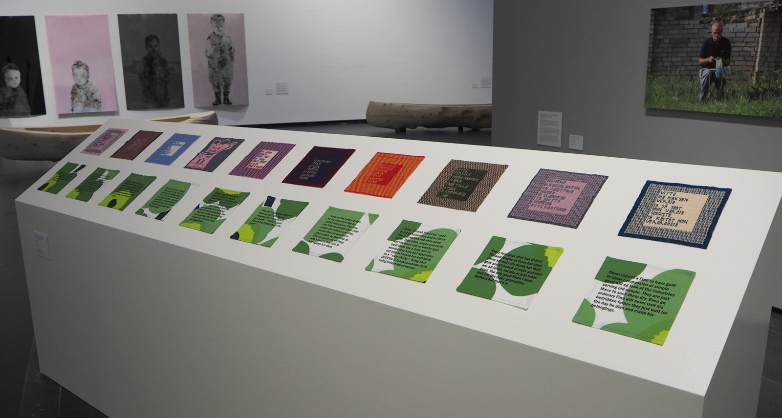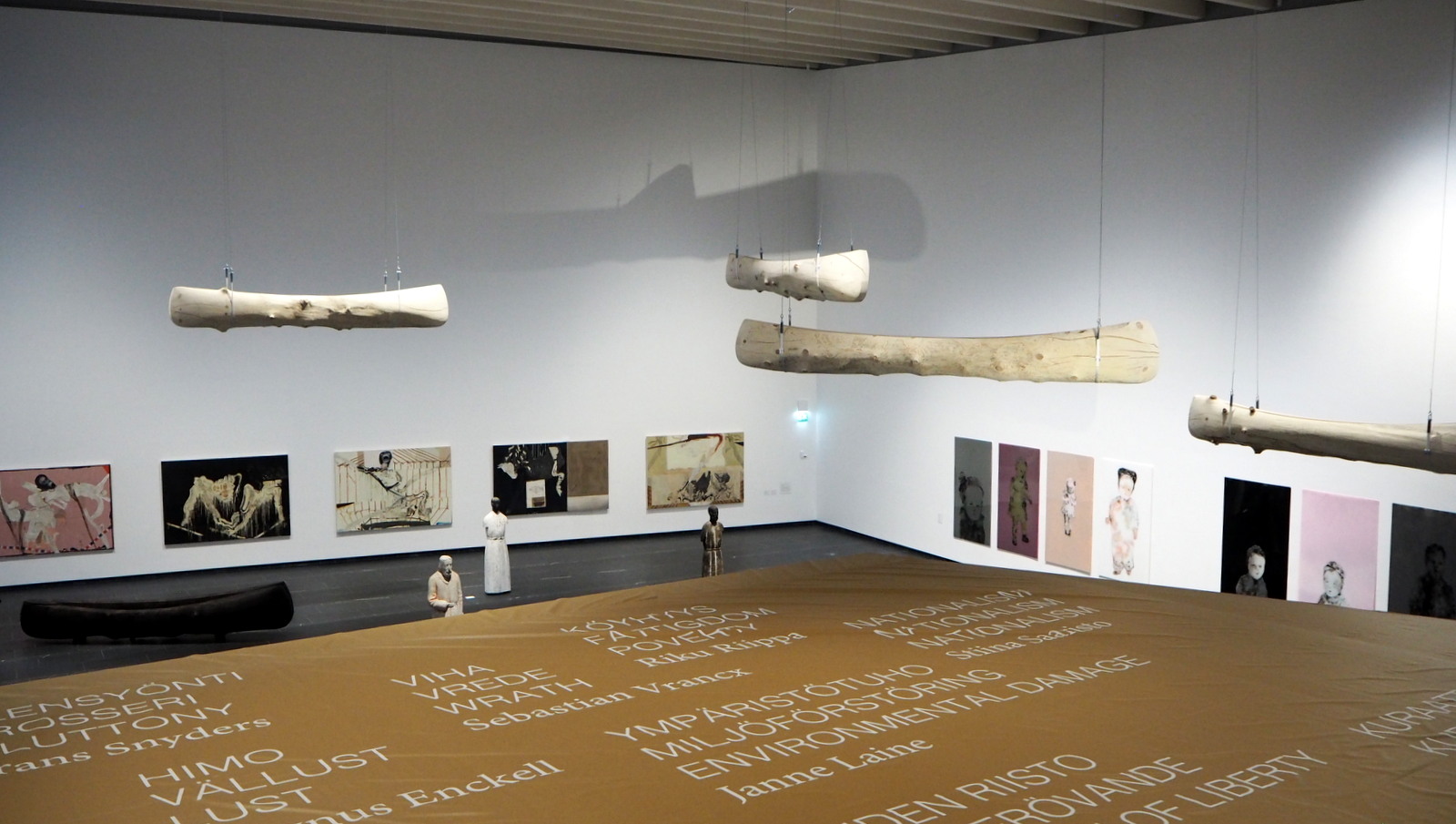 Uusista kuolemansynneistä yksinäisyyttä kuvaavat Anu Jaatisen kanootit hallitsevat tilaa, mutta ehkä sittenkin pysäyttävin oli kokoelma lausepareja, joissa on maahanmuuttajien ajatuksia suomalaisista ja suomalaisten ajatuksia maahanmuuttajista: Dzamil Kamangerin ja Kalle Hammin teokseen The Patched Culture valitut lauseet ovat molemmin puolin pysäyttävän tylyjä!