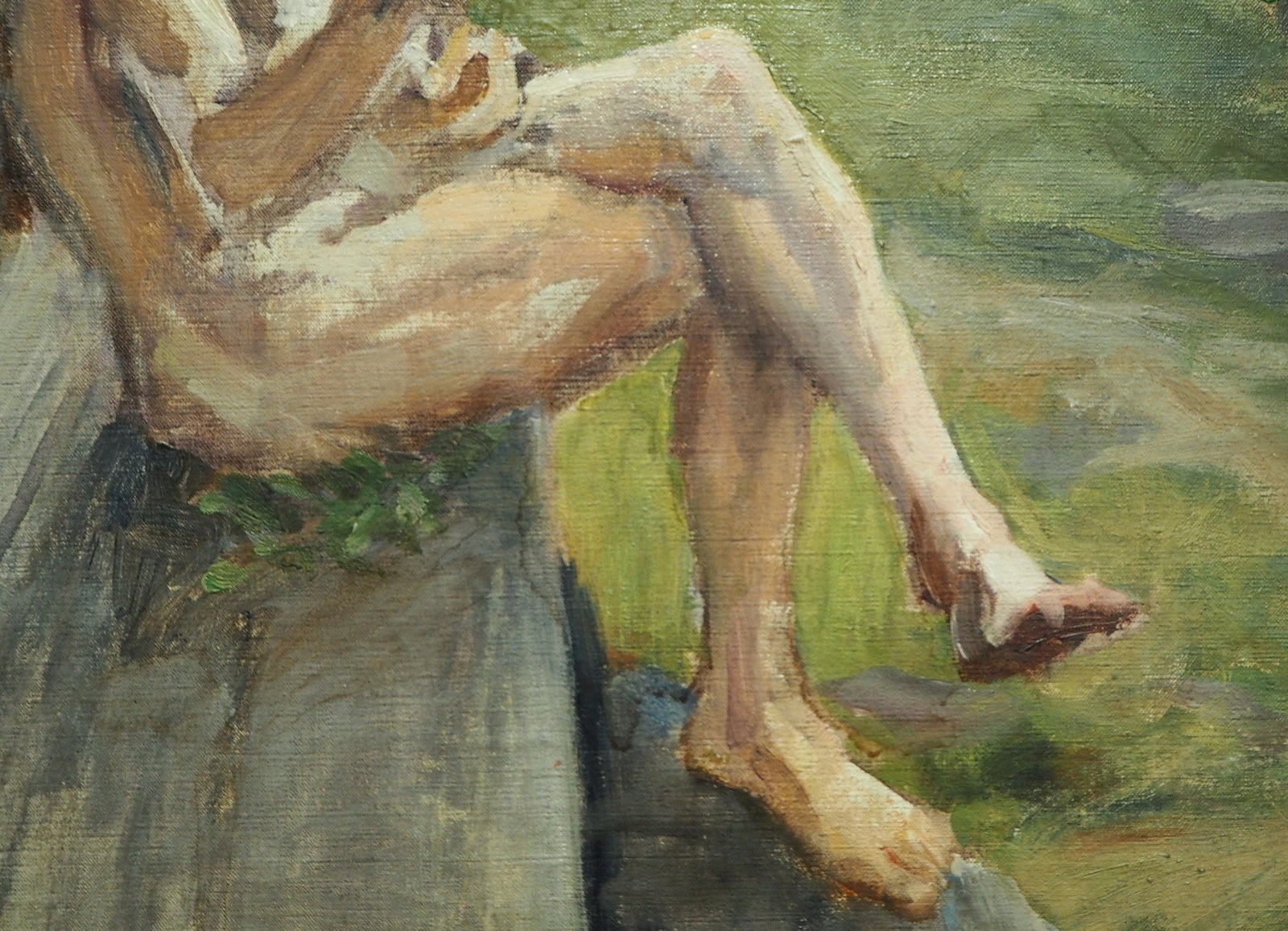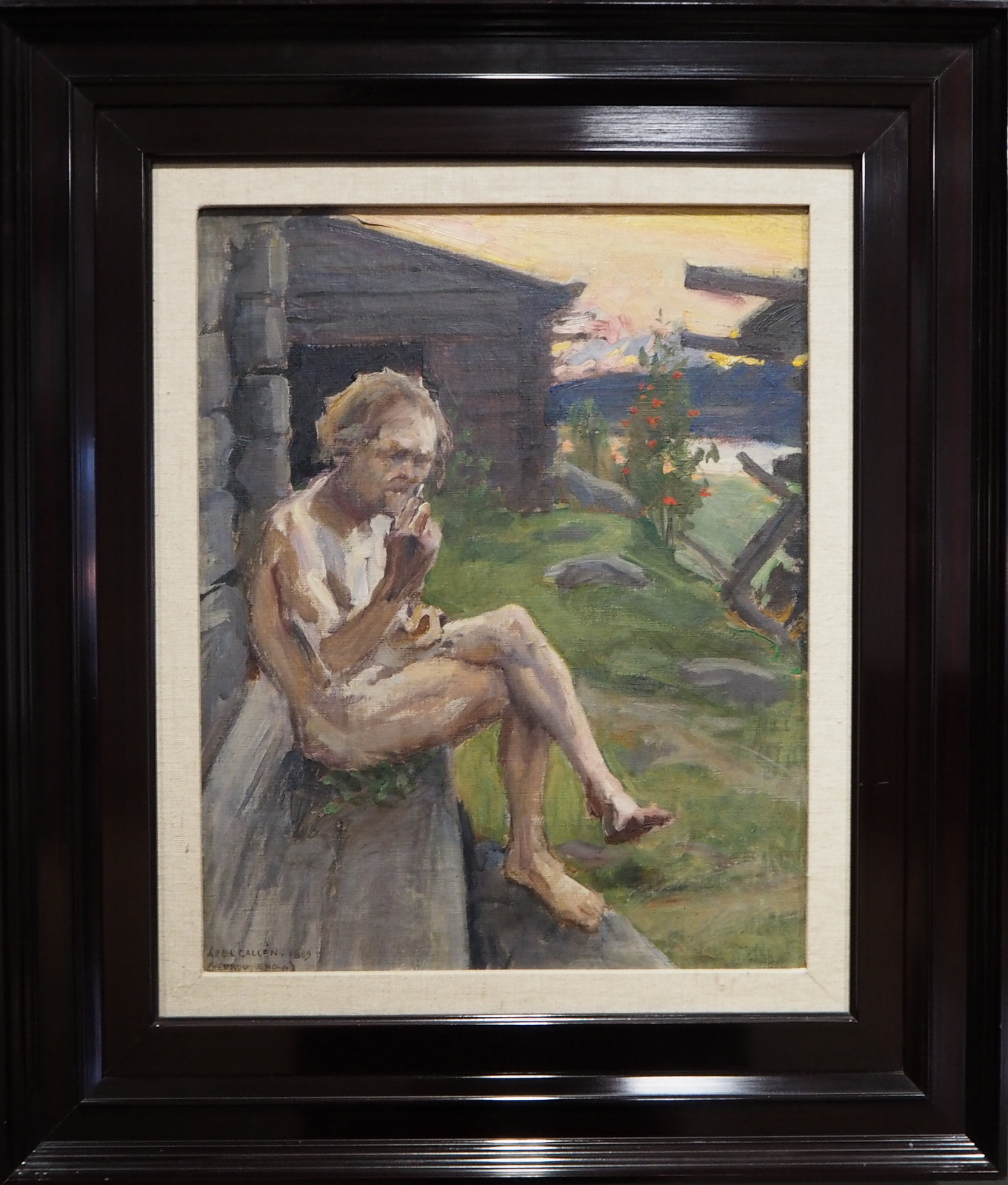 Teos Mies saunan ulkopenkillä (Akseli Gallen-Kallela, 1889) puolestaan on mielenkiintoinen jalkojen kuvausvirheen takia: yleensä ihmisillä ei ole kahta vasenta jalkaa!