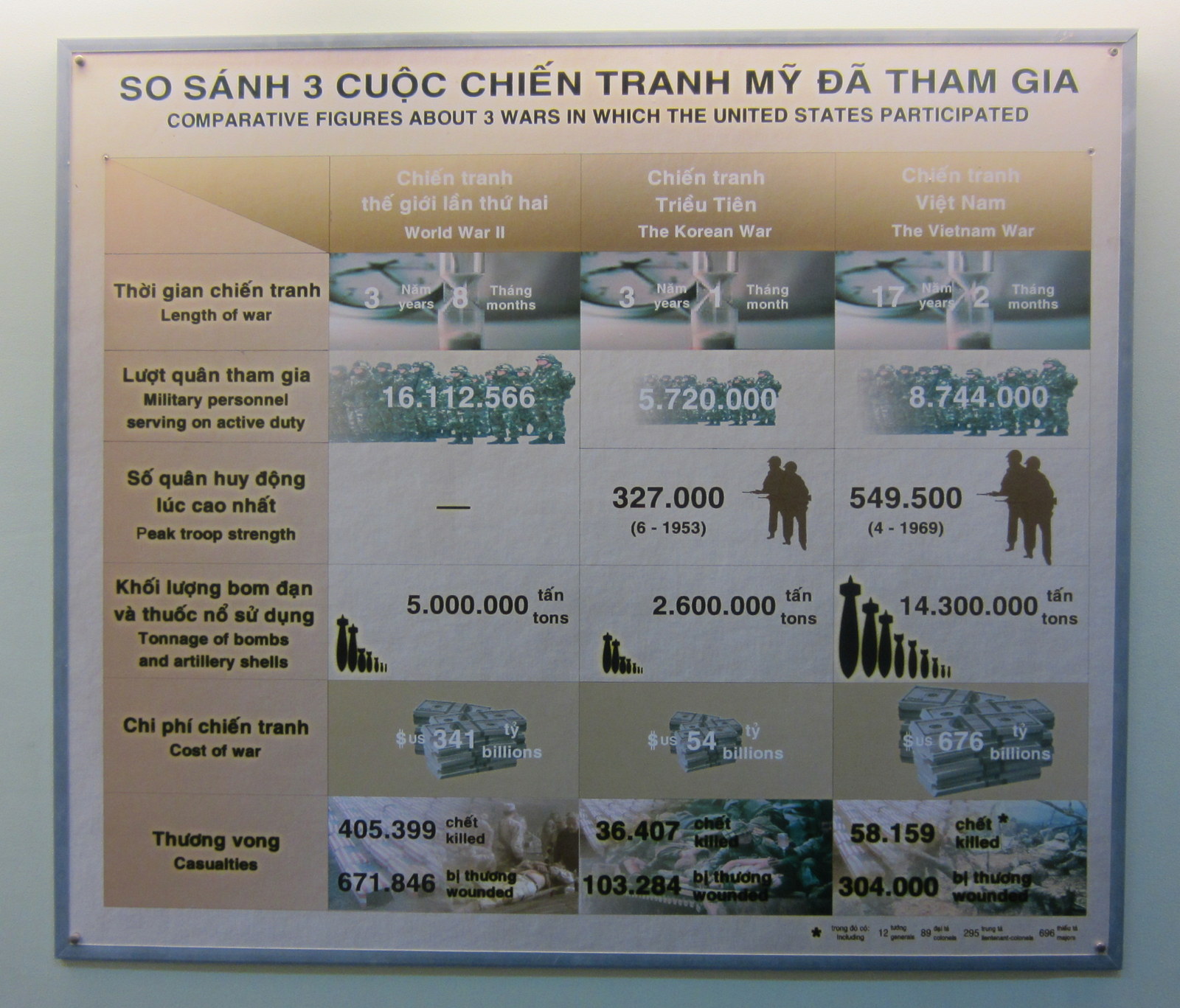 Sotamuseon näyttelyssä kuva, joka vertaa toista maailmansotaa, Korean sotaa ja Vietnamin sotaa kertoi numeroina omaa korutonta kieltään sodasta näissä maisemissa.