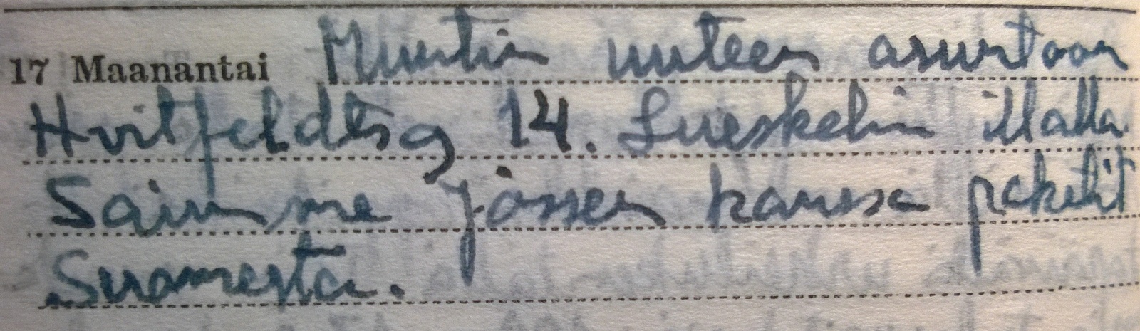 Martina – isäni käsiala on kyllä ihan omanlaisensa, noiden mainitsemieni päiväkirjojen lukeminen on itseasiassa vaatinut pientä harjaantumista, etenkin kun teksti on aika pientä ja tiivistä.