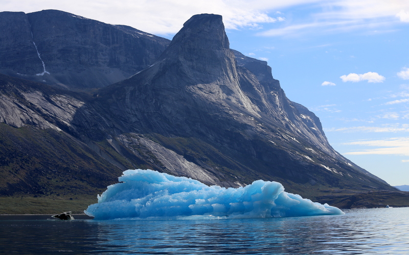 Katsomme toisiamme ja mietimme, että mihinkähän me olemme ”lupautuneet”, mutta kiipeämme veneeseen ja asetumme hajareisin istuimillemme ja matka lähes 100 kilometrin vauhdikas merimatkamme alkaa! Välillä pysähdymme ja kapteeni kertoo meille Nuukista ja vuonoista ja jonkun toisen kerran pyydämme häntä pysähtymään, kun näemme erityisen kiinnostavan näköisen jäävuoren. Näin sinisiä jäävuoria emme nähneet Ilulissatissa.