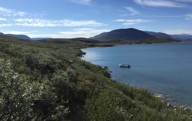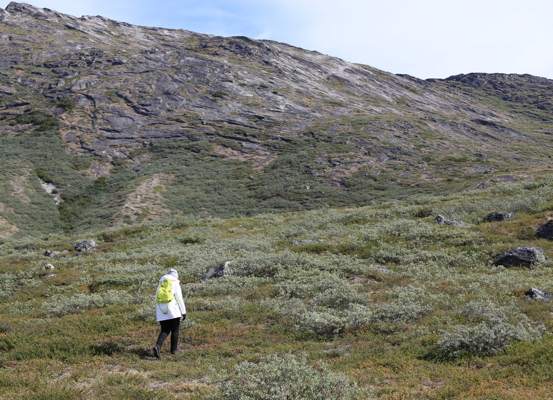Runsaan 2 tunnin itse asiassa odotuksiin nähden melko tasaisen venematkan jälkeen saavumme Kapisillit-vuonon pohjukkaan, riisumme lämpöhaalarit ja nousemme veneestä rantakiville ja lähdemme nousemaan rinnettä ylös. Paikoitellen on hiukan poluntapaista ja ylhäällä kalliolla on merkki, jota kohti nousemme. Ylhäällä meitä odottaa näkymä jäävuonolle, jota ei voi veneellä lähestyä, sillä se on täynnä jääpaloja. Pidämme kahvi/teetauon: kapteenimme on paitsi kävellyt meitä reippaammin ylös, myös kantanut repussaan termokset ja keksipaketit. Tauon jälkeen laskeudumme takaisin veneelle ja jatkamme läheiseen pieneen kylään.